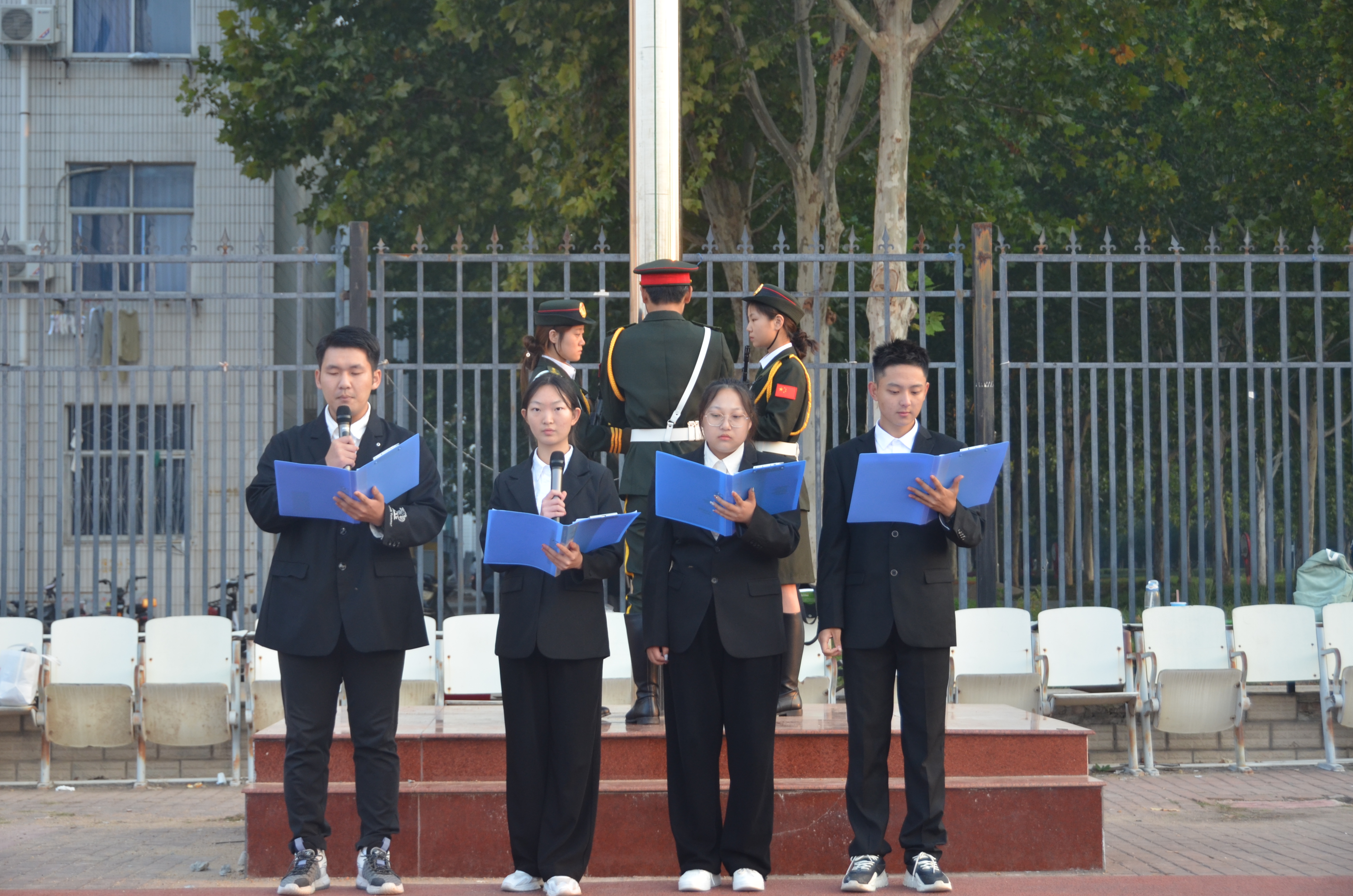 随后,学院陈昱兴、赵佳茜、赵鹏飞、王珺琦等四位同学进行国旗下的朗诵《祖国颂歌》。四位同学以饱满的热情,激昂的语调朗诵了一首爱国主义诗歌,诗歌中充满了对祖国的热爱和对未来的信心。在场师生深受感染,共同感受到爱国主义的深厚情感和我院学子为实现中华民族伟大复兴而奋斗的坚强决心。
