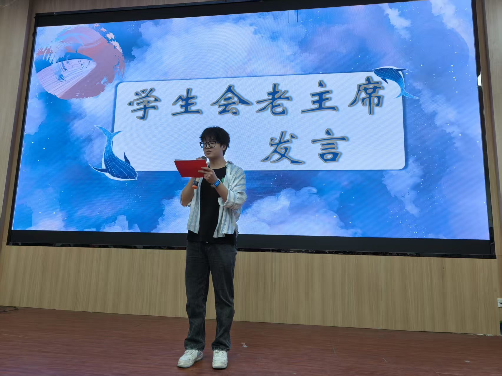 活动伊始,学院党委书记李海涛、2021级辅导员郭家瑞依次上台致辞。他们回顾了毕业生们在校期间的成长与蜕变,对其在团学工作中展现出的责任担当与奉献精神给予高度肯定,希望毕业生们在未来的人生道路上,能够继续保持积极向上的心态,勇于迎接挑战,在新的领域发光发热。原学生会主席刘浩作为学生代表发言,给学弟学妹们送上美好的祝福。