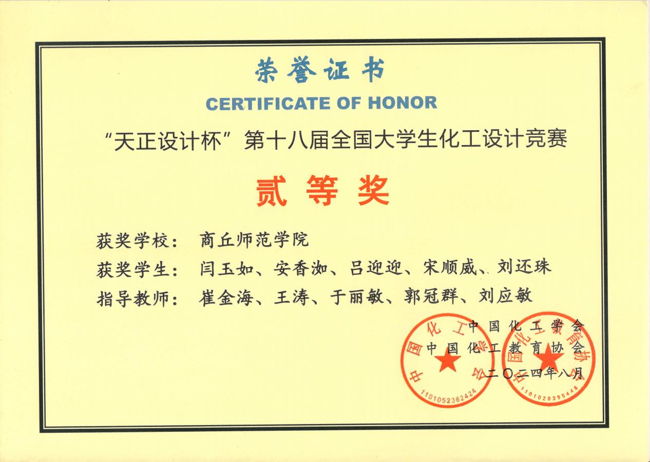 近期,由中国化工学会、中国化工教育协会联合主办的2024年“汇泰•欧倍尔杯”第十八届全国大学生化工设计竞赛全国总决赛圆满落幕。经过激烈角逐,我院由闫玉如、安香洳、吕迎迎、宋顺威、刘还珠五名学生组成“醇臻生产队”在崔金海等老师的指导下再创佳绩,荣获“天正设计杯”第十八届全国大学生化工设计大赛二等奖。