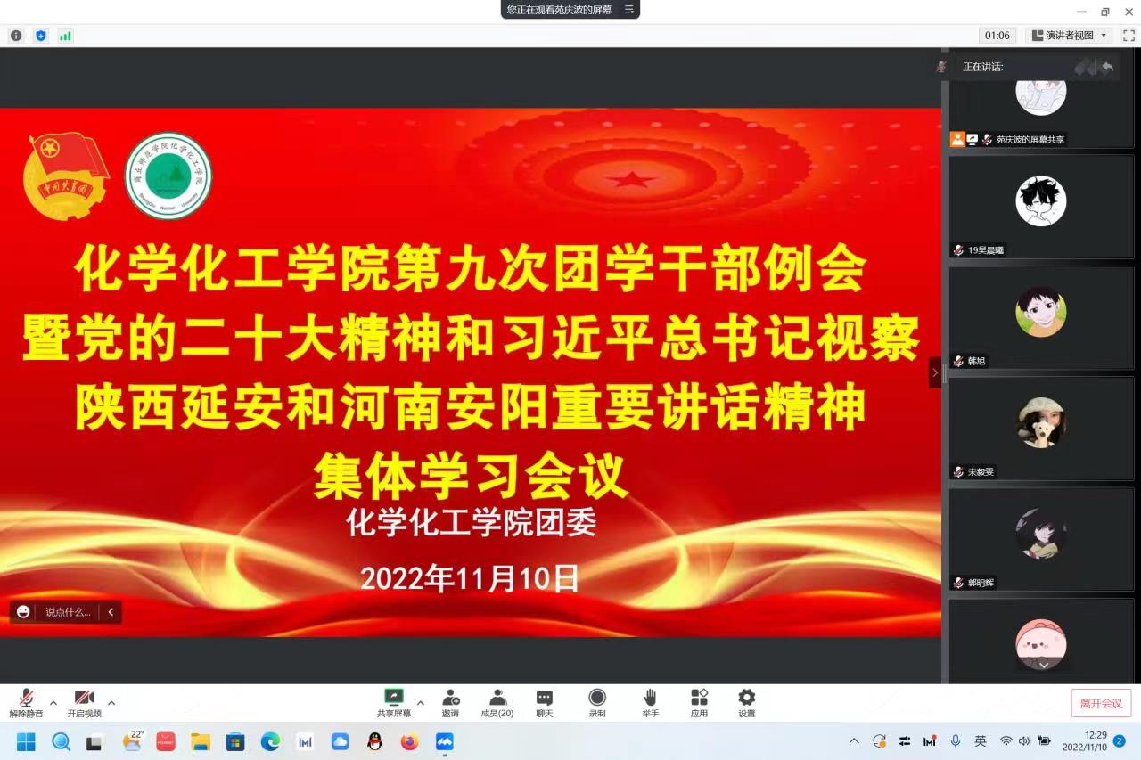 为了持续深入学习党的二十大精神和习近平总书记重要讲话精神,将学习和日常工作结合起来,用党的二十大精神指导推动工作,11月10日,麻豆精品㊙️国产传媒AV团委以腾讯会议的形式召开了第九次团学干部例会暨党的二十大精神和习近平总书记视察陕西延安和河南安阳重要讲话精神学习会议。院团委副书记郭家瑞主持会议,团学干部参加会议。