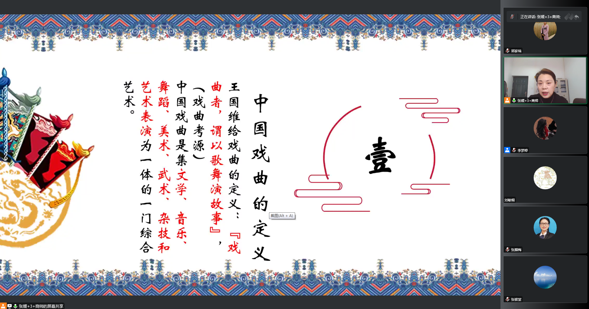 张媛院长首先介绍了戏曲文化的重要性,接着讲述了戏曲的起源,表明中国戏曲萌芽于原始歌舞,经秦汉发展,到宋金形成了完整的戏剧形态,后又借王国维的话,引出了对中国戏曲的定义。随后向同学们简要介绍了戏曲种类和五大剧种,并详细介绍了商丘特有的剧种——豫东调。在此过程中,让同学们认识到了传统戏曲的文化魅力,拓宽了艺术视野。最后又分别论述了戏曲的艺术特点和表演形式,并播放了《红灯记》、《智取威虎山》等片段让同学们欣赏。在讲授中,张媛院长亲自演示戏曲表演动作、演唱经典戏曲片段,展示了扎实的表演功底。