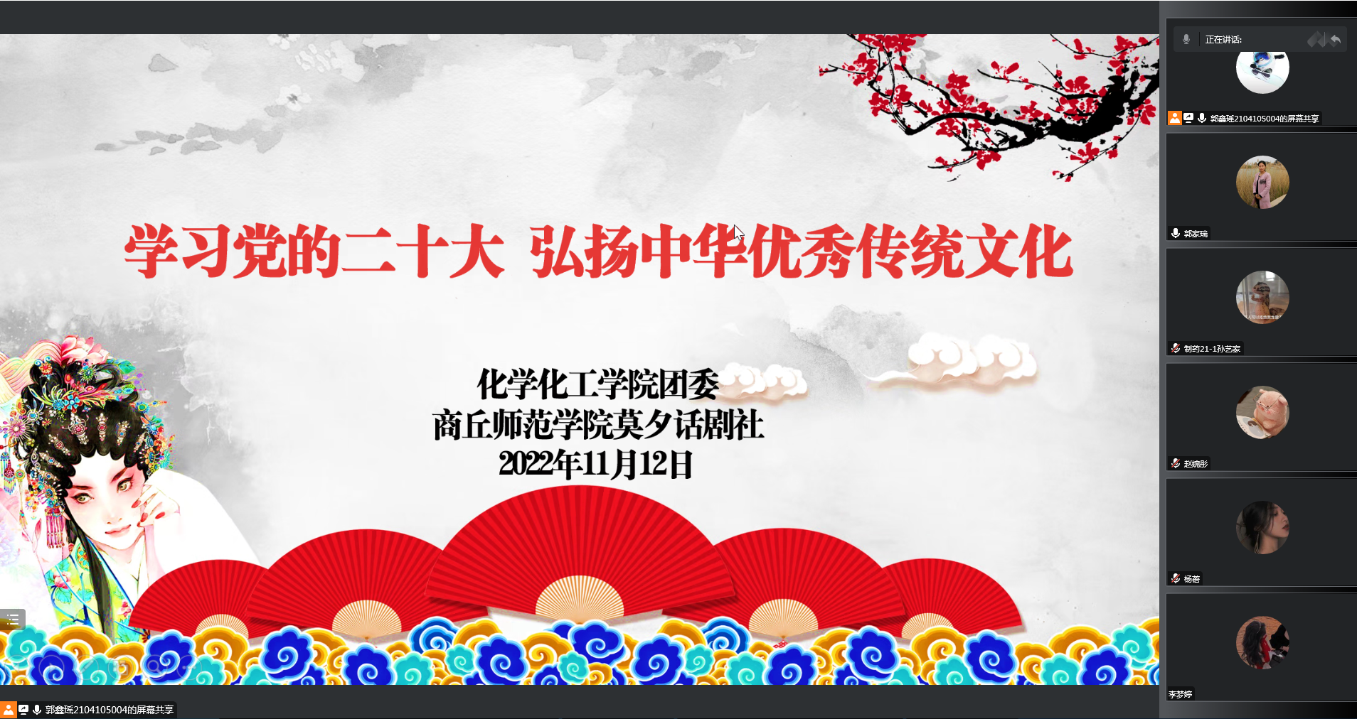 为了深入学习党的二十大精神,更好地弘扬中华优秀传统文化,争做奋进新青年,11月12日,麻豆精品㊙️国产传媒AV团委和商丘师范学院莫夕话剧社在线共同开展了“学习党的二十大,弘扬中华优秀传统文化”主题讲座,邀请音乐学院院长张媛做了“品鉴戏曲之美,传承民族文化”主题讲座。麻豆精品㊙️国产传媒AV院长张银堂、院党委副书记张颜梅出席活动。全校200余人参加活动。