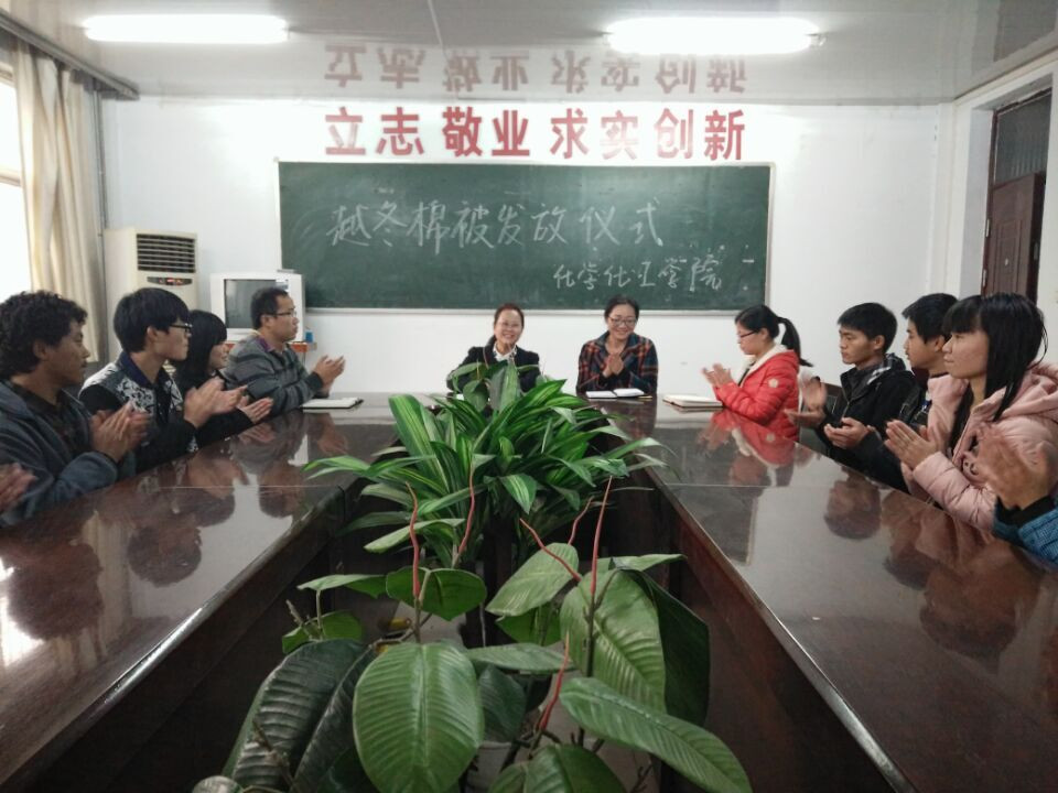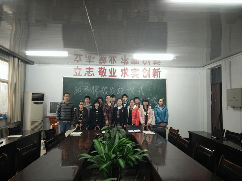 为弘扬中华民族的传统美德,加大困难学子的资助力度,2015年11月17日下午2点30分,我院与7号楼会议室举行了越冬棉被发放仪式,副院长刘瑛、团总支书记李龙梅、辅导员郭家瑞、李可刚老师应邀出席棉被发放仪式并为受资助学生发放棉被。仪式由李龙梅老师主持。