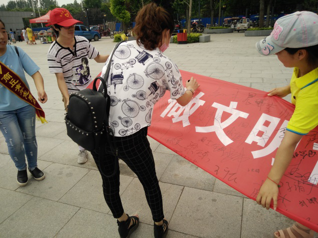 在商丘博物馆中,遇到游客的不文明游览现象,各成员均积极去进行劝说制止。当发现游客有在场馆内大声喧哗,用闪光灯进行拍照,手机未调成静音或振动模式等影响其他游客游览的行为时也立刻前去进行劝解。在发现游客有攀爬文物、敲击文物等毁坏文物行为时会及时进行制止。同时,让游客在条幅上签字,以使游客意识到文明旅游的重要性。