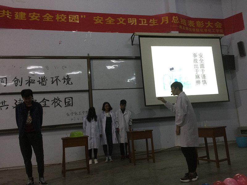 会议伊始,首先以VCR的形式展示了我院在安全文明卫生月期间的活动成果。接着,以情景再现的形式,生动形象地阐释日常生活中大学生常见的安全问题,蕴含在剧中的意义引起大学生深深的思考。其中情景剧《别忘记锁门》讲述了骗子以推销为借口进入学生宿舍进行诈骗的过程,警示同学们时刻提高警惕,保护自身安全;情景剧《安全源于谨慎》用诙谐幽默的方式,在娱乐大家的同时,也让同学们意识到实验室安全的重要性;手语舞《礼》以其温柔优雅、姿势优美的特点,展现了中华文明礼仪之美。随后,李龙梅老师向我院师生发出了倡议:一、积极行动,以主人翁姿态投身创建活动;二、从我做起,争当创建活动先锋;三、齐心协力,塑造师院美好新形象;四、勤奋向上,严谨求实,勇于创新。随之,刘瑛书记与李龙梅老师对情景模拟大赛和十佳宿舍获奖者进行了颁奖,并合影留念。