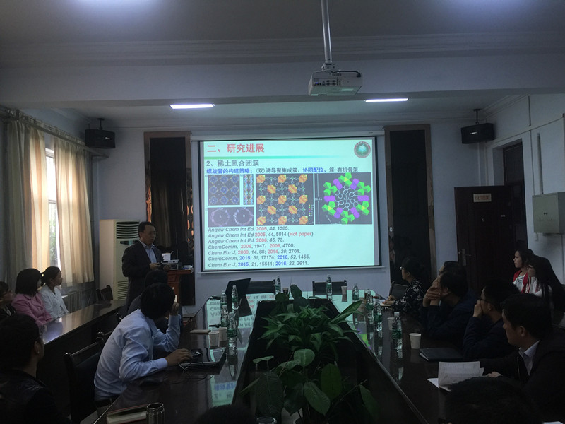报告会上,杨国昱教授从氧合团簇化学的特点、研究和应用现状出发,提出当前该领域所面临的重要问题,并介绍了他们课题组基于缺位导向、缺位协同导向、导向组装、配体诱导、协同配位及自聚合与诱导聚集等学术思想所取得的一系列创新性研究成果,形成了独特的氧合团簇化学研究体系,不仅推动了氧合团簇化学的发展,而且被国内外同行多次引用和高度评价。李建荣教授介绍了其在金属有机多孔材料方面开展的工作。这类材料的结构和性能多样并且容易调控,在多个领域具有潜在的应用价值。李建荣教授在报告中介绍了近期在该领域的研究结果,包括MOPs的可控合成及新合成策略的发展和基于MOPs构筑单元的MOFs的设计合成及其在膜分离、气体吸附等领域的潜在应用。赵斌教授从金属有机框架(MOFs)的研究现状出发,向大家介绍了其团队主要工作:从金属节点的选择上进行创新,通过选用非常见低氧化态/构筑金属-金属键/高核数金属簇等手段,构筑新型MOFs,并从化合物的分子结构,电子结构及功能性方面进行研究。报告结束后,三位教授与在座师生进行了亲切交流并对学生提出的问题进行了解答。