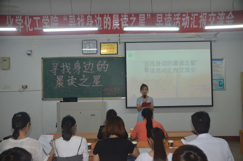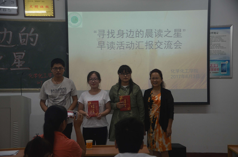 参加本次交流会的各团队是由各班的早读成员组成的,各团队代表采用PPT演讲形式进行小组早读情况的展示和汇报。在交流会中,各团队代表首先介绍了各团队的成员,接着,他们用照片展示了快乐的早读时光,各团队代表认真的汇报了早读的情况,总结了经验,交流了心得,查找出自身的坏习惯并提出了对策。交流会结束后,我院党总支副书记刘瑛作了精彩点评,她指出此次交流会的举办不仅激发了我院学子的读书热情,也锻炼了我院学子的语言表达能力,促进我院学子养成良好的早读习惯,最后,她希望我院更多学子加入到早读活动中,带动我院的学习风气。