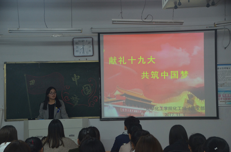 11月1日晚,麻豆精品㊙️国产传媒AV化工16-1团支部于我校文化路校区1#405教室举办了以“献礼十九大,共筑中国梦”为主题的团日活动,我院团总支书记李龙梅、副书记王宇杰及张太政出席了此次活动,活动由化工16-1团支部的团支书张丽主持。
