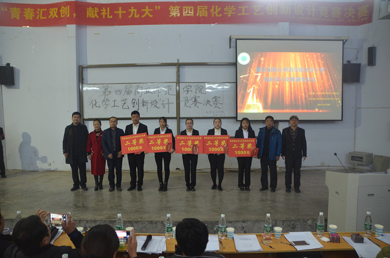 经过初赛、复赛的激烈角逐,共有八支团队进入决赛,各团队负责人进行了汇报和答辩。每支团队的讲演都十分精彩,不仅有PPT的演示,还有视频的展示,使到场领导老师赞不绝口。比赛中还有抽奖环节、改编的《青花瓷》歌曲演唱表演和化学知识抢答比赛,带动并活跃了整个会场的气氛。最终,评出了一二三等奖,其中皂动生活——打“皂”自然之美、“会呼吸”的涂层和新型氮杂化卡宾钯化合物的设计与催化性能的研究获得了一等奖,每个团队获得2000元的奖金。领导老师分别为获奖选手颁发了荣誉证书和奖金。比赛后我院孟团结副院长从专业的角度对比赛作了点评,他对我院学生提出要求与建议,他指出我院学生务必要把化学基础知识掌握牢固,学会应用所学的化学知识在相关行业、领域做出一定的成绩。最后,创新创业学院院长周鲲鹏对比赛进行了总结点评,他对活动环节的严密性、活动的扣题性、参与团队的分工合作精神和化学工艺研究方向等几个方面给予了很大的肯定和赞扬,并提出了宝贵的建议。