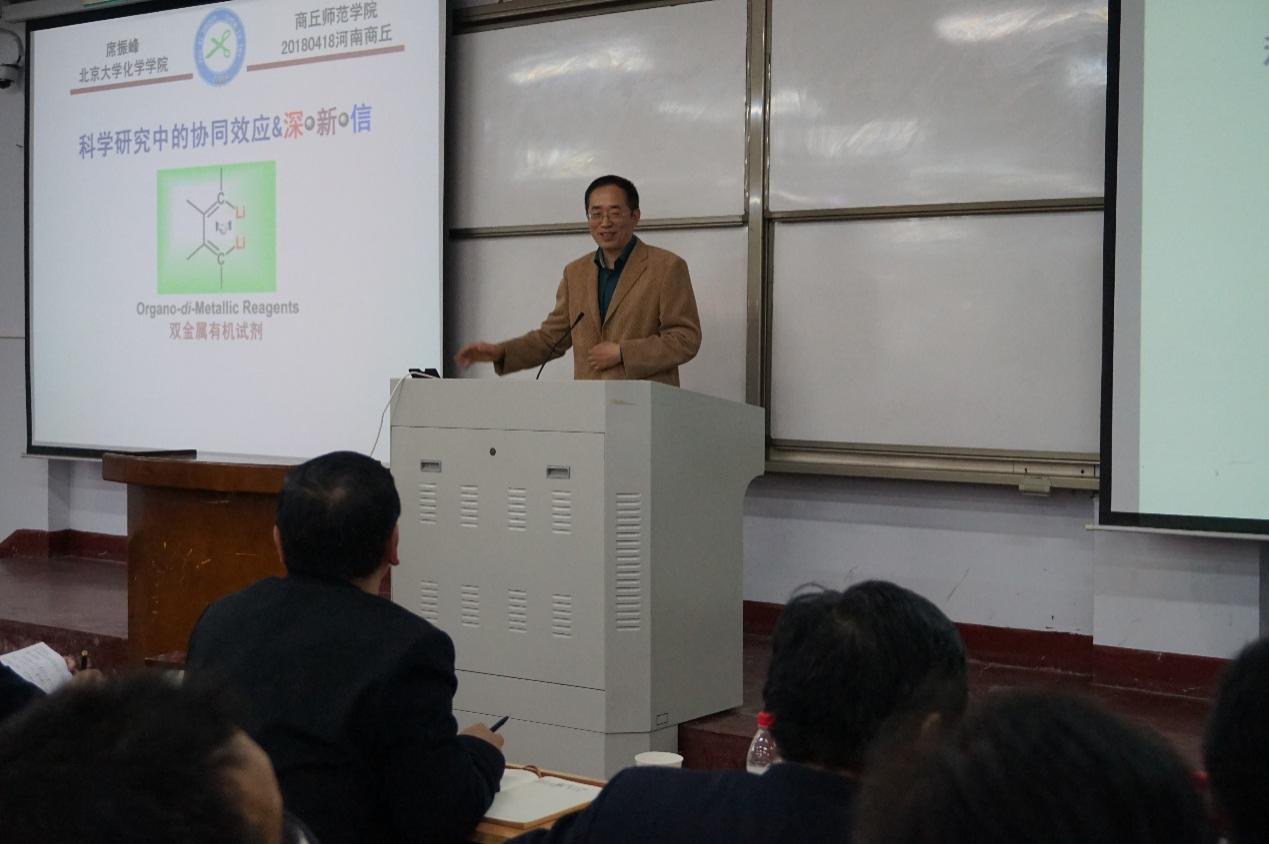 4月18日,在睢阳校区1号楼308教室,中国科学院院士、北京大学席振峰教授莅临我校,做了“科学研究中的协同效应与深信新”的学术报告,通过座谈会对化学学科的青年教师进行了悉心指导,与青年学生亲切互动。徐茂田副校长主持了学术活动。