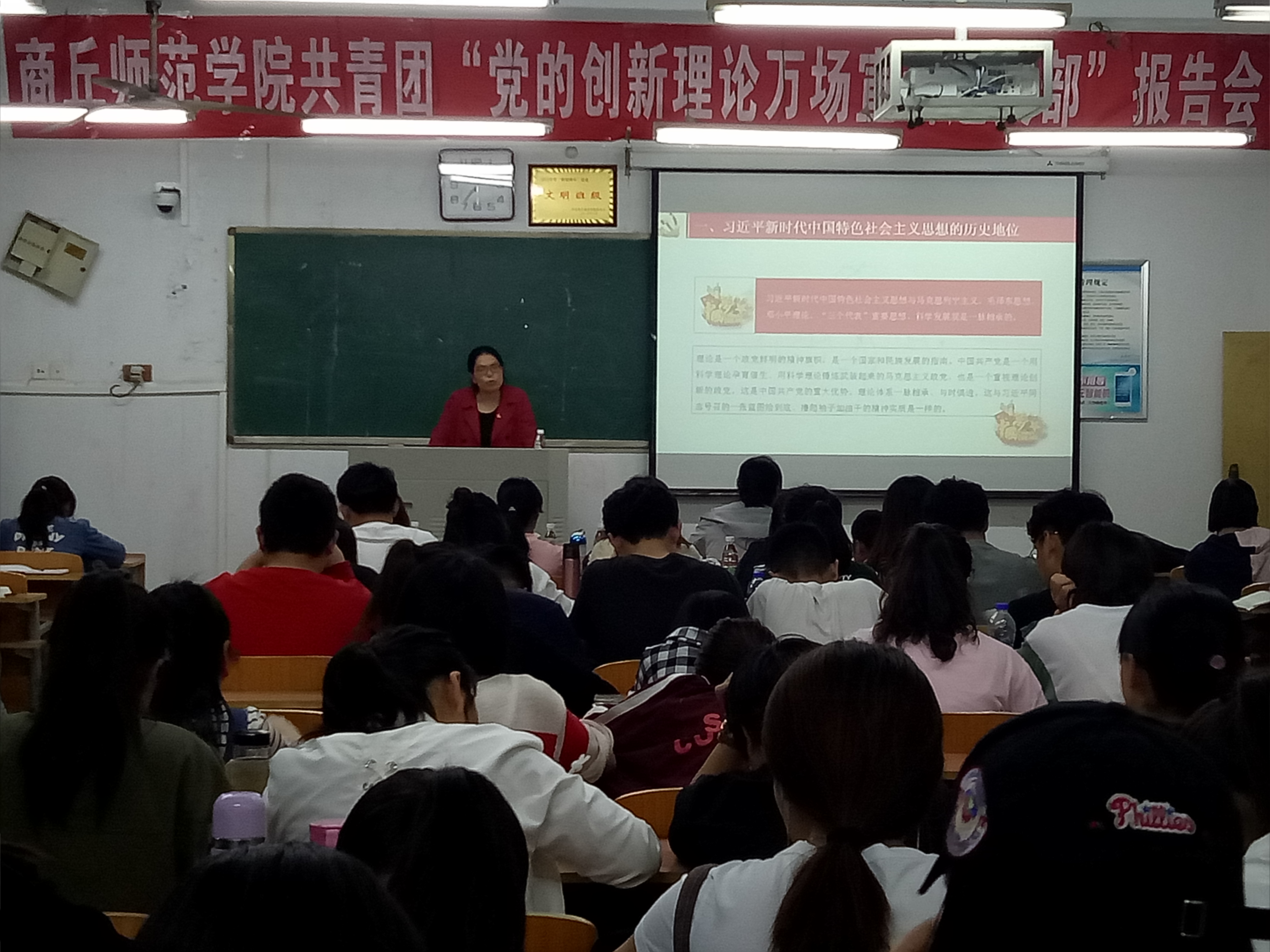 4月19日晚七点,麻豆精品㊙️国产传媒AV于文化路校区1#408举办了“商丘师范学院共青团‘党的创新理论万场宣讲进支部’报告会”。本次报告会的主题为“习近平新时代中国特色社会主义思想的历史地位和丰富内涵”,主讲人为我校教师教育学院团总支书记董若颖,麻豆精品㊙️国产传媒AV团总支书记李龙梅主持报告会,16、17级各支部团支书、组织委员和宣传委员及17级各支部部分学生到场聆听。