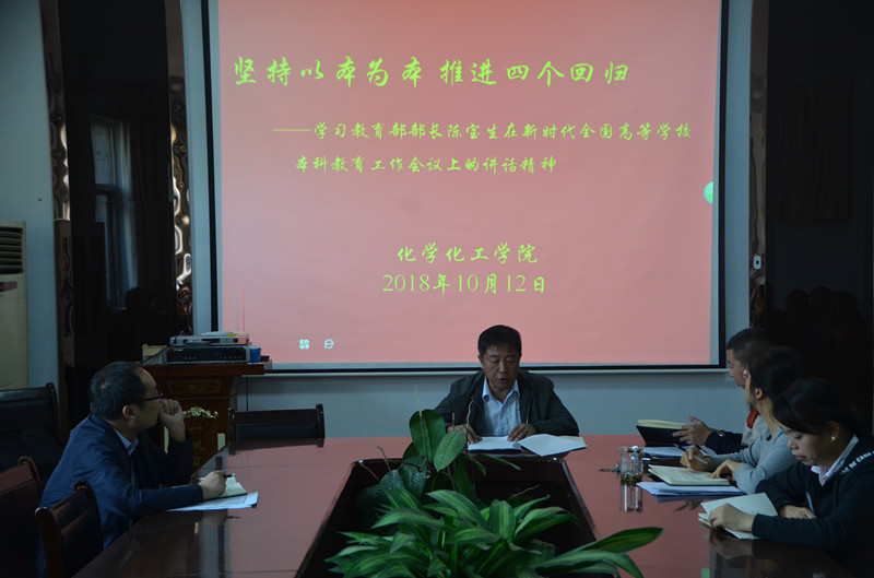 接着韩书记带领大家一起学习陈宝生部长在会议上的讲话要点,明确指出为加快建设高水平本科教育,要坚持以本为本,推进四个回归,建设中国特色、世界水平的一流的本科教育;要深刻学习和领会习近平新时代中国特色社会主义思想,牢牢把握高等学校根本任务和根本标准;要坚持“以本为本”,推进“四个回归”;要写好“奋进之笔”,建设高水平本科教育,推动重点领域、关键环节改革不断取得突破。