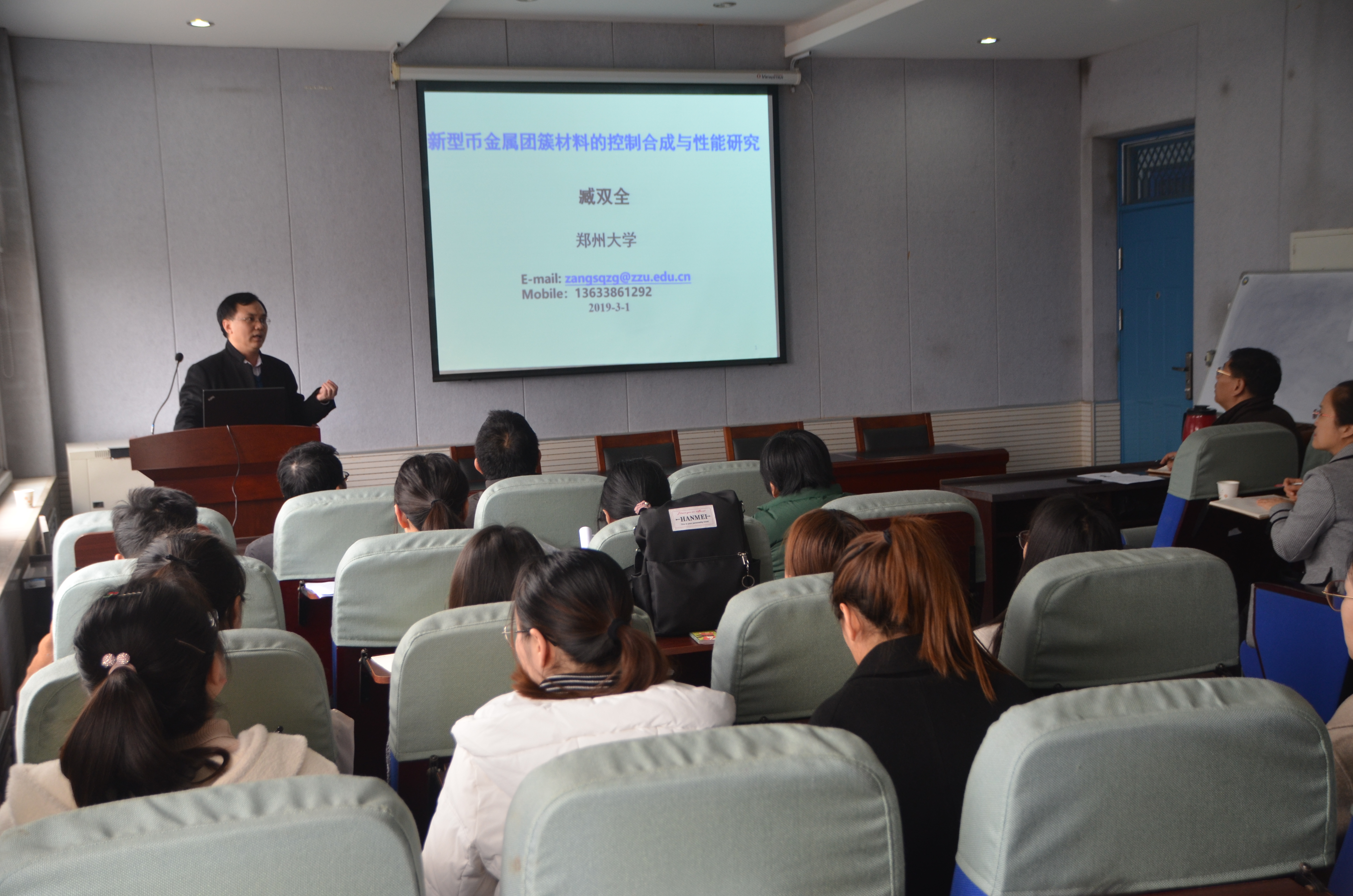 臧双全教授首先介绍了金属团簇材料的特点以及其发展面临的问题,针对银硫团簇材料在应用方向出现的不稳定问题,通过配体的修饰和功能化,合成出具有高活性高稳定性的新型晶体发光材料,通过对其发光机制的研究,拓宽了金属团簇材料的功能性应用。臧教授以幽默风趣的方式向在场的师生分享了自己科研上的发现以及每一项成果背后的故事,并介绍了团队的发展历程。报告会后,臧双全教授与青年教师就基金申报及撰写方面给予了进一步指导,认真阅读了每位申请人的国家自然科学基金申请书,对基金撰写过程中出现的问题逐一指出,提高了申请书的水平同时帮助了青年教师的成长。