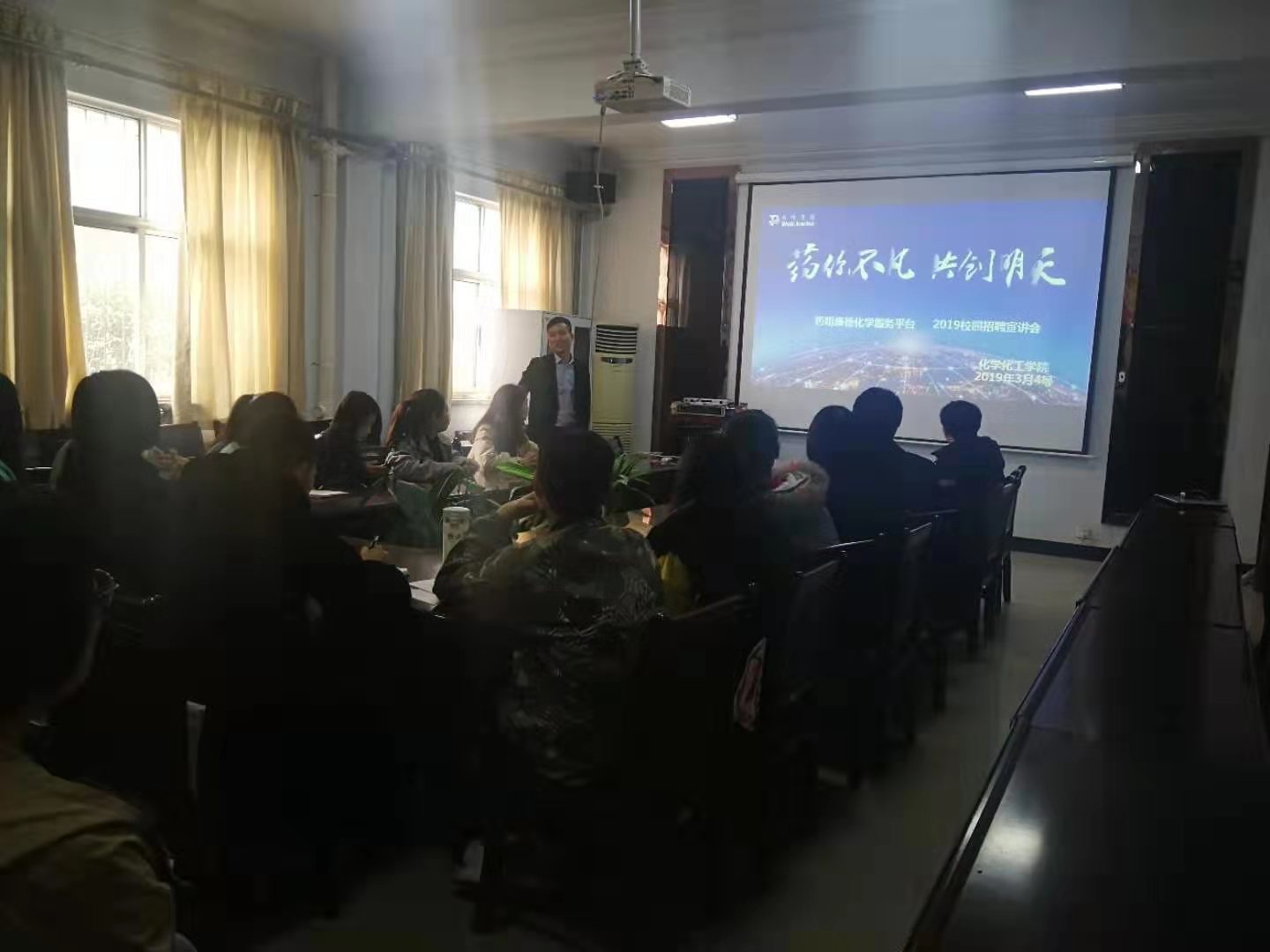 招聘宣讲会上王金龙主任从集团新药的研发方向、集团的合作伙伴、分支机构以及集团的成长之路等多个方面对集团进行介绍,使在座的同学们更好的了解药明康德集团的运营方式及管理体制。其中王金龙主任着重介绍了公司最早的研发部门化学服务部以及该部门的招聘政策。化学服务部本着“安全合规,以人为本”的原则进行科研,拥有世界一流的设备和“不拘学历,唯才是用”的晋升体制,会上展示的本科毕业生就业的薪资及补助政策吸引着在座的同学们,部分同学积极的递交了简历。招聘宣讲会结束后,宣讲嘉宾们还为有需要的同学们做了热情的答疑。