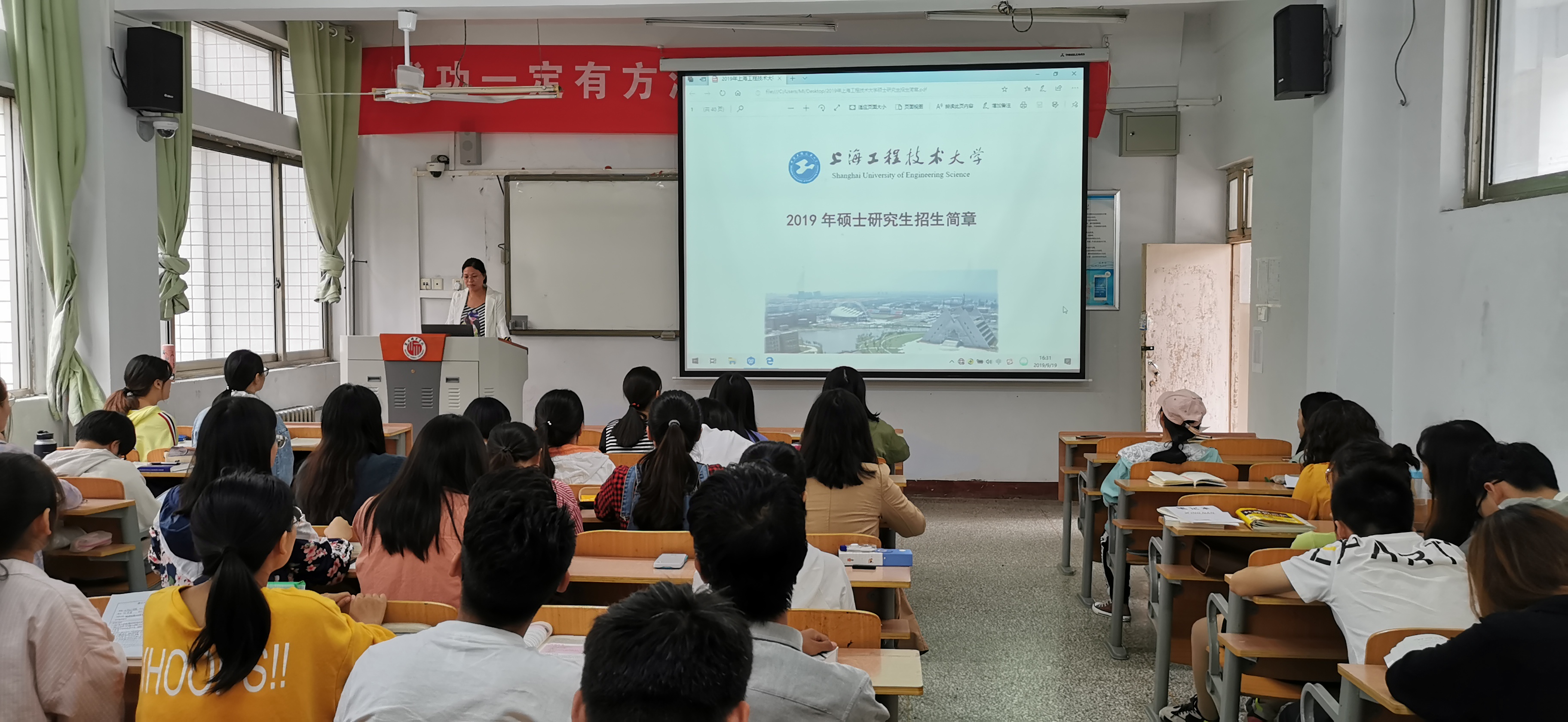 上海工程技术大学是一所工程技术、经济管理、艺术设计等多学科互相渗透、协调发展的全日制普通高等学校,是教育部“卓越工程师教育培养计划”首批试点高校和全国地方高校新工科建设的牵头单位。宣讲会上,郭家瑞先简单介绍了招生专业简章目录和研究生入学考试参考书目,接着介绍了研究生奖助体系、学术创新、海外学习交流、产学研基地、升学就业、重点学科六个方面,并且鼓励学生加强专业知识的学习,坚定信心,提前准备,提高考研成功率,继续深造,做最优秀的自己。