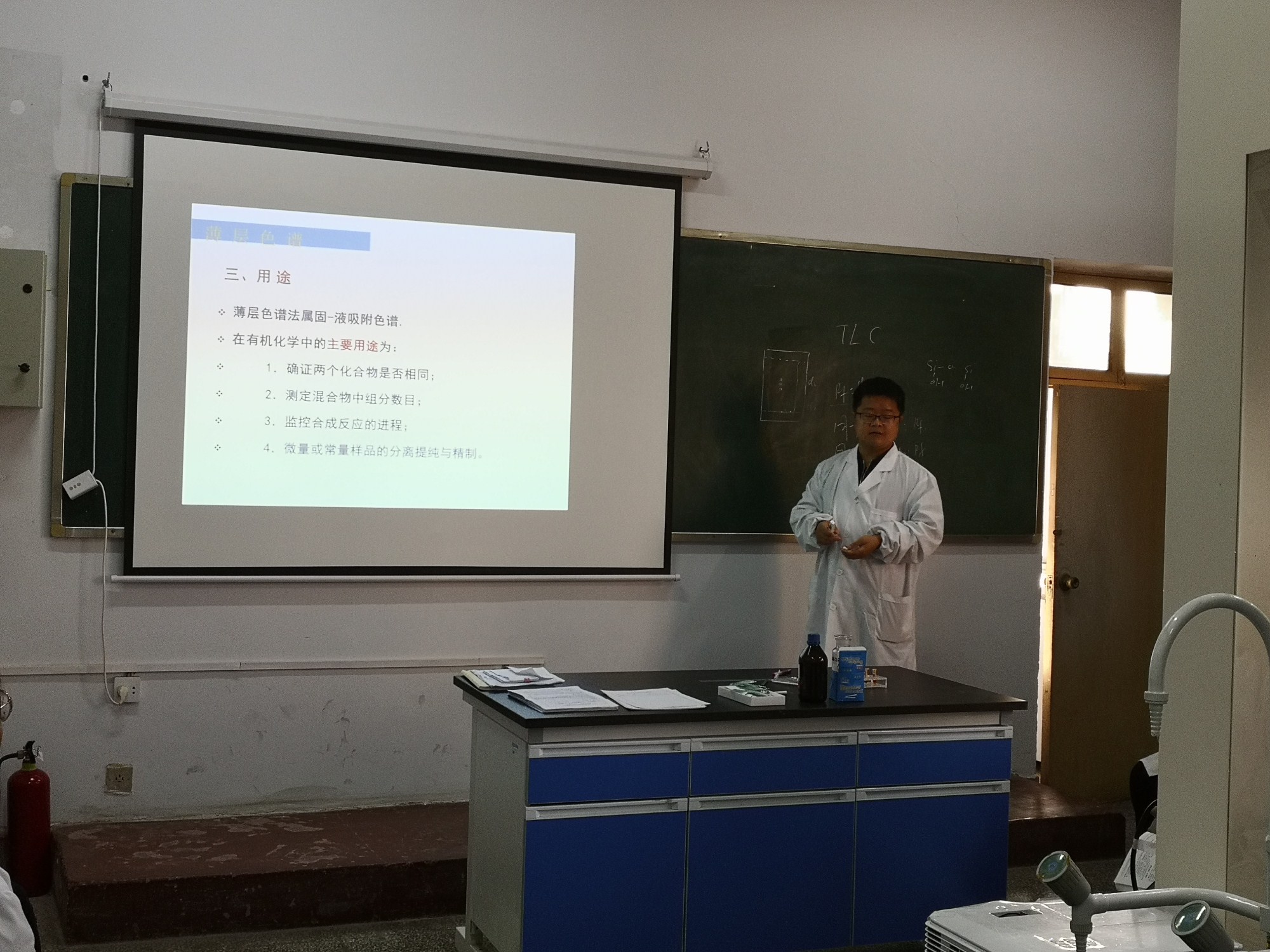 《有机化学实验》是制药工程系主任王涛老师主持立项的商丘师范学院教学范式改革课程,讲授环节采用翻转课堂的形式。本次实验内容为薄层色谱,先由学生讲解本次实验的目的、原理、内容以及注意事项,然后老师做补充说明,充分调动学生学习的积极主动性,高效地实现了课堂教学目标,充分体现“以学生为主体,以教师为主导”的范式改革课堂教学理念,课堂上同学们参与度高,学生学习氛围和学习效果较好。