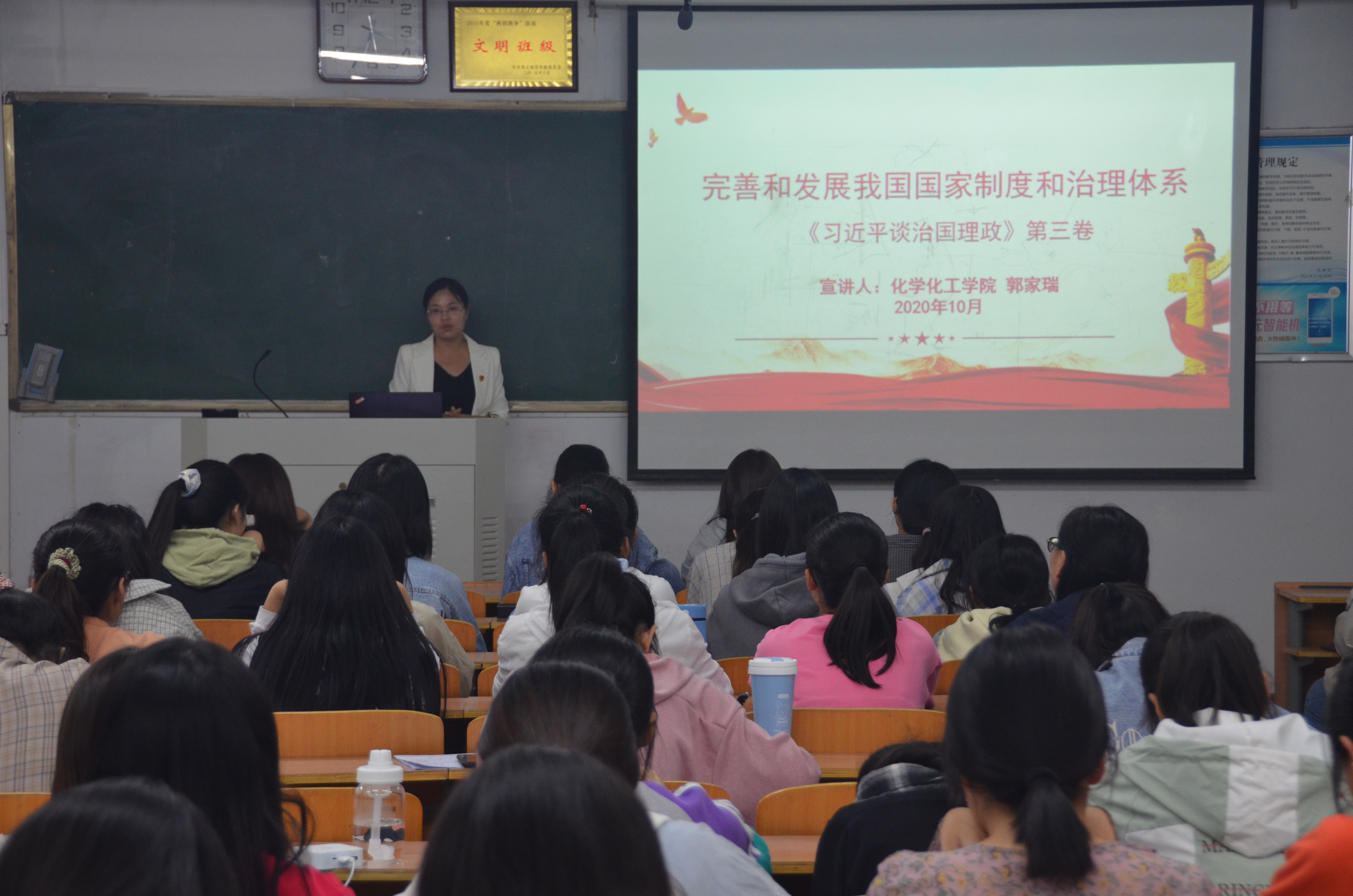 接着,从两个方面跟大家进行交流。一是“我国国家制度和治理体系的显著优势”,并结合疫情大考,在党的坚强领导下,全国人民万众一心,共克时艰,使疫情在最短的时间内得到有效的控制的例子,让大家对我国国家制度和治理体系的显著优势有了更深的了解。二是从“坚持和完善我国国家制度和治理体系的重大意义”,强调中国特色社会主义制度和国家治理体系需要不断的坚持和巩固、不断的完善和发展,使中国特色社会主义制度和国家治理体系更加科学严密,更有效率活力,更加成熟定型,不断展现出更加显著的优势。最后,郭家瑞希望同学们不忘初心,牢记使命,只争朝夕,不负昭华。