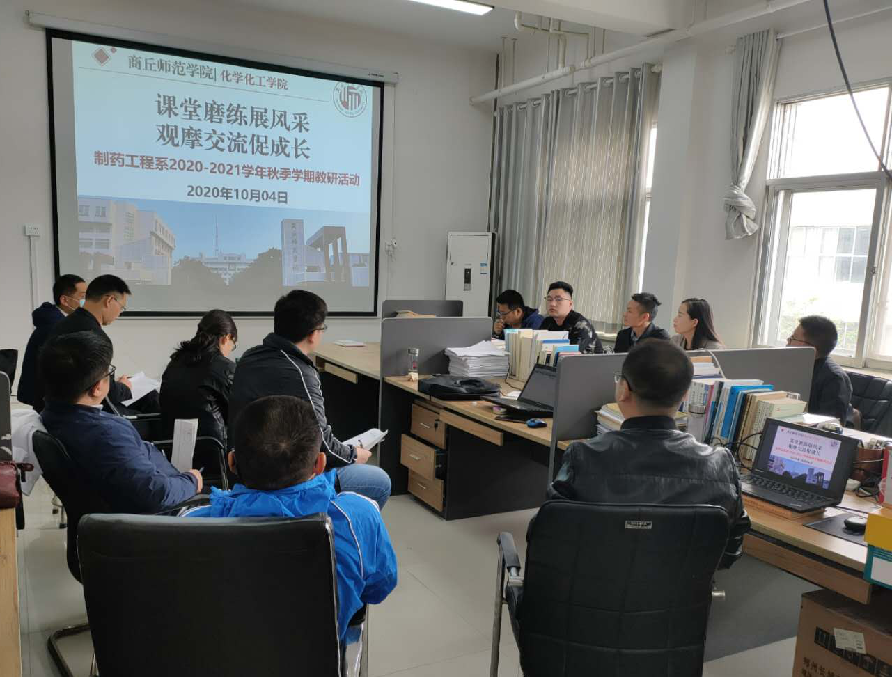为进一步提高新入职青年教师的专业素养和教学能力,夯实青年教师驾驭课堂的基本功,落实学校学院青年教师培养计划,2020年10月04日制药工程系在化学实验楼416室召开了以“课堂磨练展风采,观摩交流促成长”为主题的教研活动。教研活动由系主任王涛老师主持,制药工程系全体老师参加此次活动。