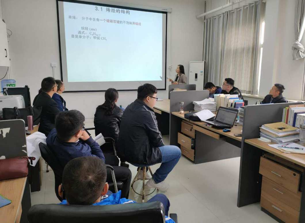 教研活动中孙超婧老师以《烯烃的结构》为题对烯烃π键的形成及其特点进行了重点讲述,刘传志老师以《共价键》为题对水分子的结构、形成及其特点进行了讲解。