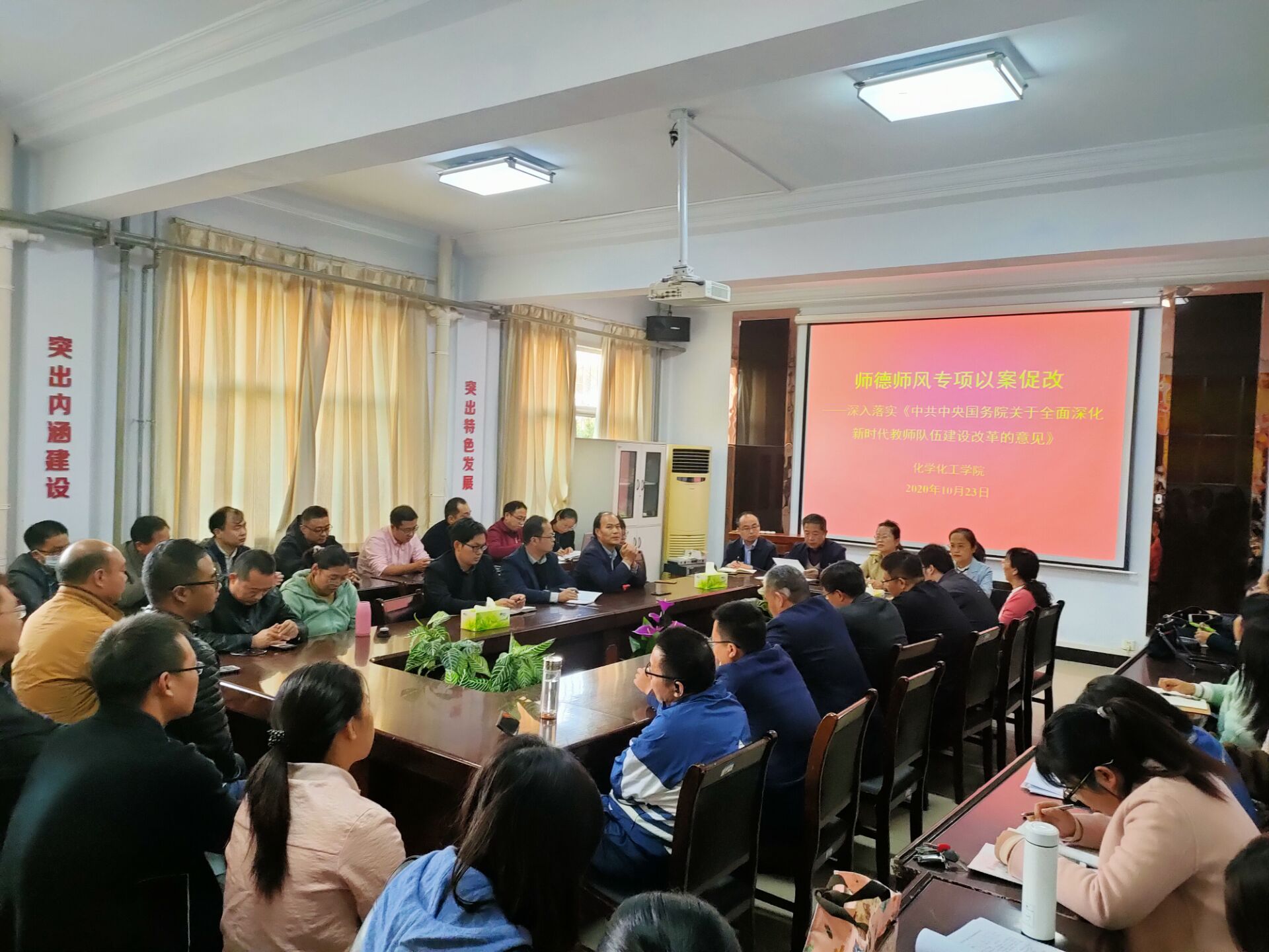 会议以发生在大家身边的师德失范的典型案例,对师德师风建设进行警示教育。再次学习了《中共中央国务院关于全面深化新时代教师队伍建设改革的意见》文件精神。韩忠民进一步强调加强师德师风教育的重要性、必要性,分析了当前学校教师师德师风存在的问题,并从爱岗敬业、廉洁从教、为人师表、关爱学生等方面对教师的行为提出了具体的要求。要求各党支部切实抓好师德师风建设,教育引导广大教师以德立身、以德立学、以德施教、以德育德,争做“四有”好教师,全心全意做学生锤炼品格、学习知识、创新思维、奉献祖国的引路人。
