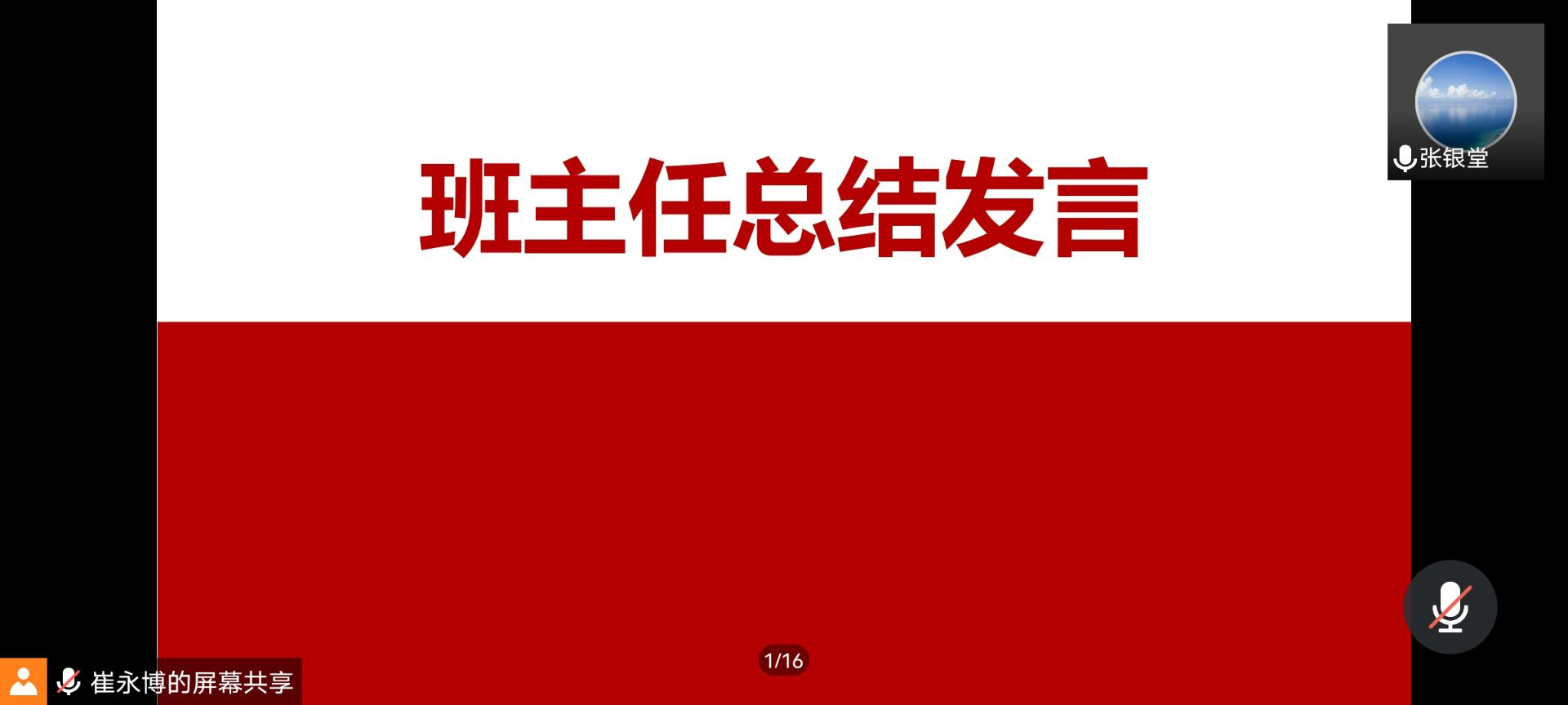 之后班主任张银堂发言,提出寒假为充电的时间,同学们要合理回顾去年同期事情,列成表,制成自己本年的目标,提前准备与学习,同时在生活上帮助父母,在闲暇时间关注家乡情况;班会最后,主持人播放了精心制作的短视频提前给大家拜个早年。