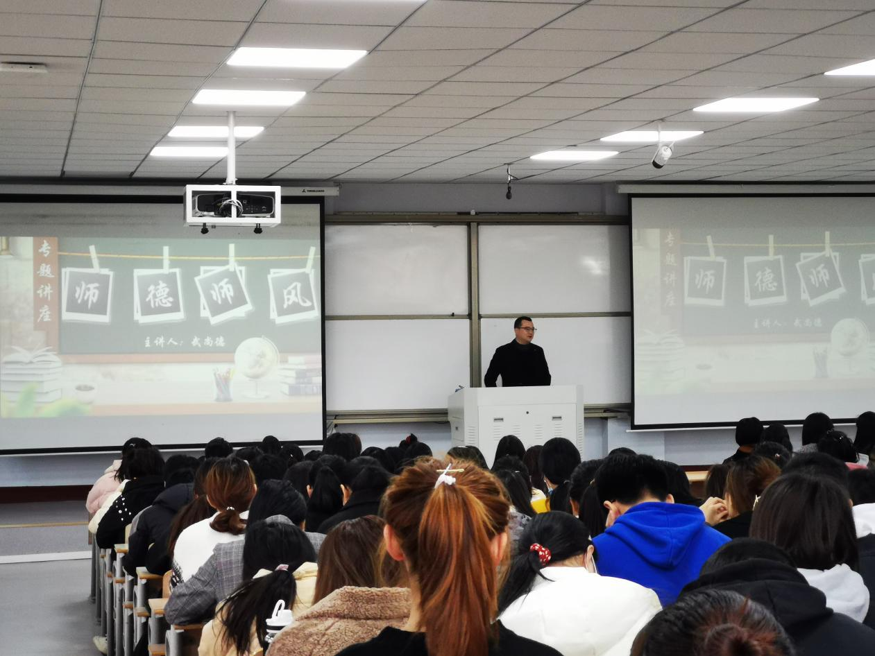 武尚德老师从师德的定义,教师职业道德规范的历史沿革,教师职业道德的内涵与要求,礼仪与教师礼仪,新时代教师职业道德规范等方面进行讲解。武老师的报告情真意切、娓娓道来,他通过亲身经历的具体事例,深深地教育并打动了在场的每一位学生,是一堂生动的师德教育课。