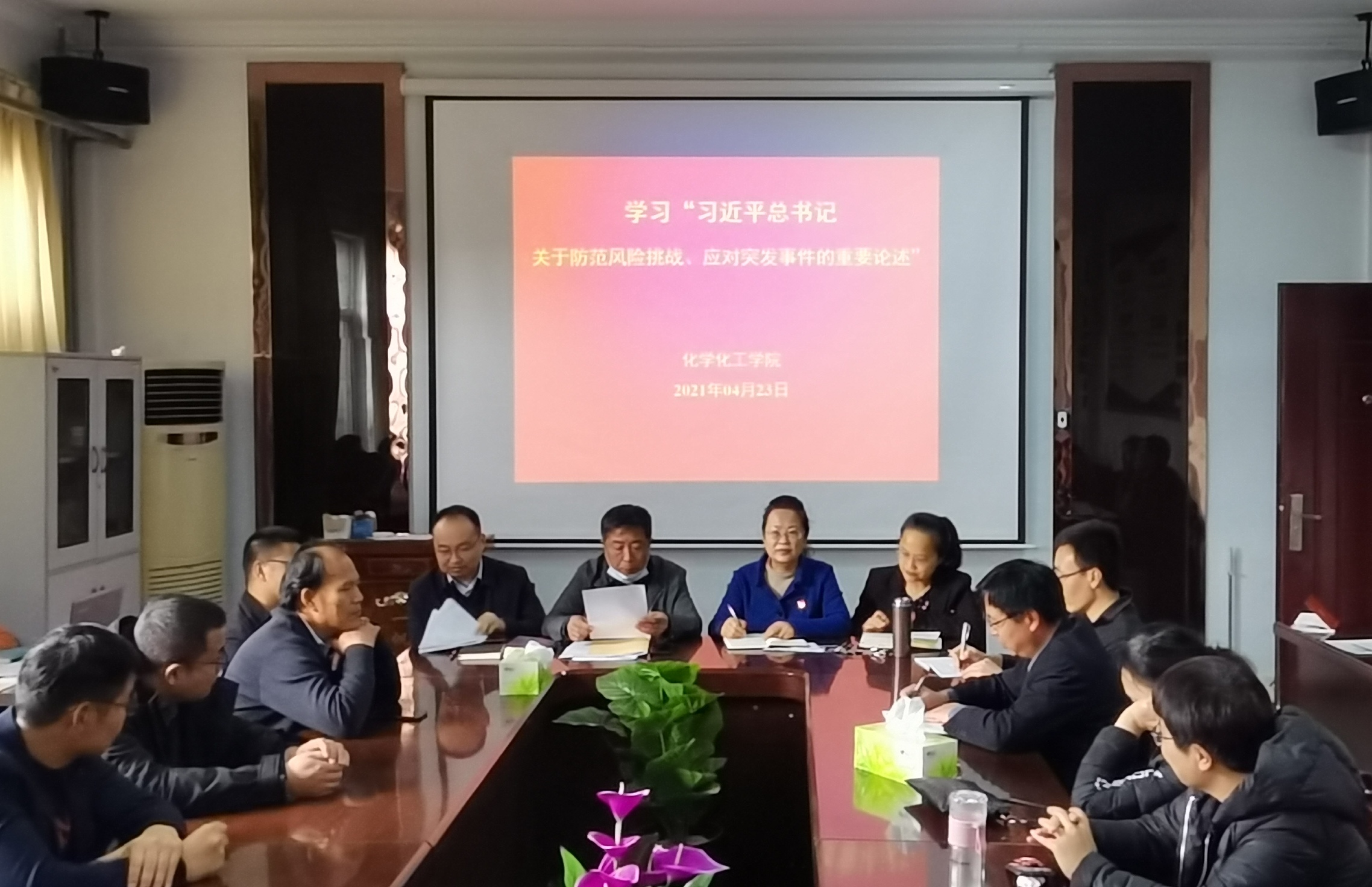 会上,韩忠民领学了“习近平总书记在清华大学考察时的重要讲话精神”、“习近平总书记关于防范风险挑战、应对突发事件的重要论述”、“王战营副省长在我校上思政课的重要讲话精神”三部分内容。首先,韩忠民强调了要认真学习习近平总书记在清华大学考察时的重要讲话:让青春在不懈奋斗中绽放绚丽之花,激励广大青年肩负历史使命坚定前进信心。随后,韩忠民指出要深刻领会习近平总书记关于防范风险挑战、应对突发事件的重要论述,要全面提高防控能力,着力防范化解重大风险、保持经济持续健康发展的社会大局稳定,为实现“两个一百年”的目标而顽强奋斗。最后,韩忠民要求要全面落实王战营副省长在我校上思政课的讲话精神,深刻领悟“中国共产党为什么‘能’,马克思主义为什么‘行’,中国特色社会主义为什么‘好’”。
