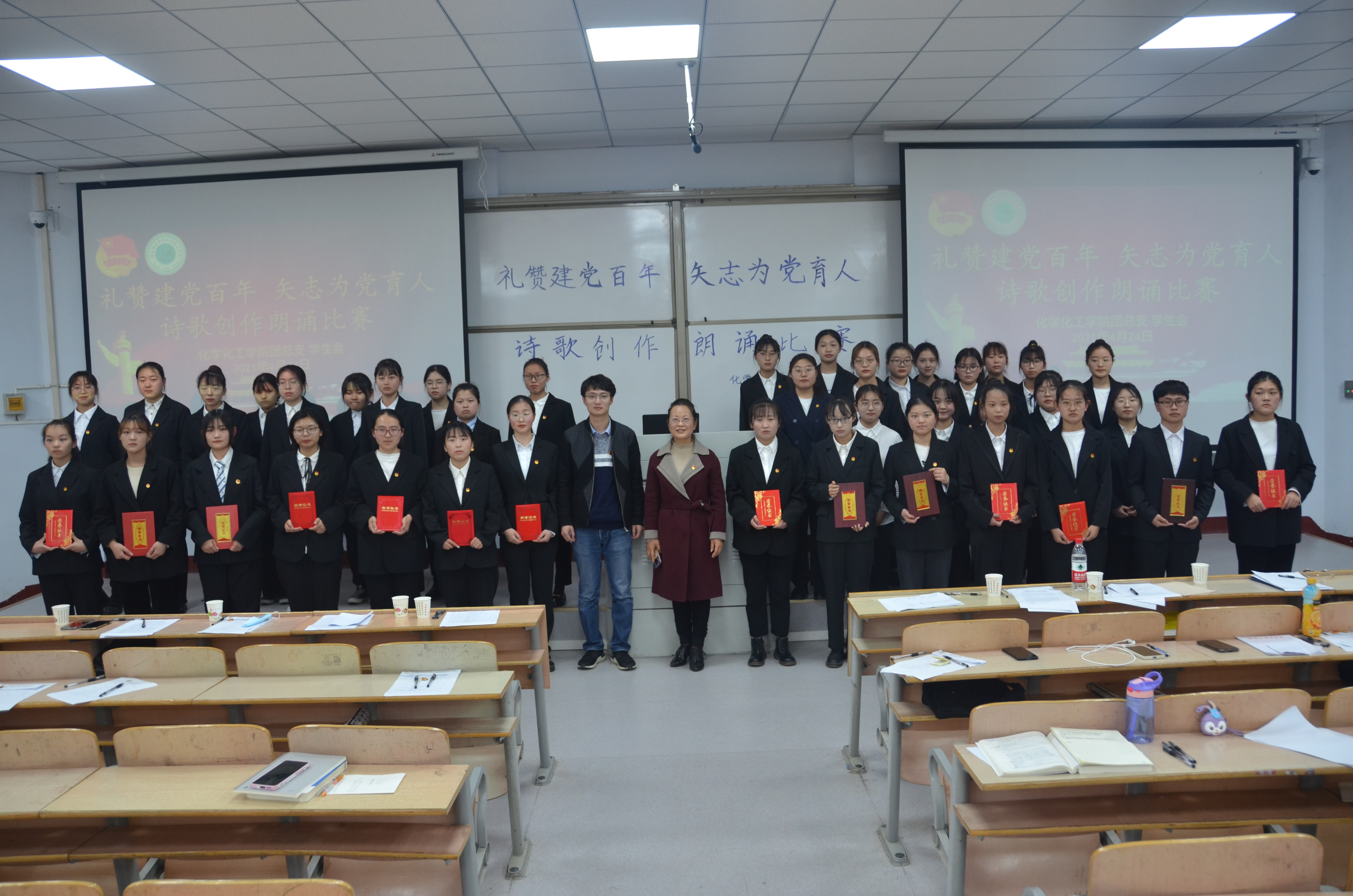 为隆重庆祝中国共产党成立100周年,引导学生弘扬革命传统、传承红色精神,鼓起迈进新征程、奋进新时代的精气神,2021年4月24日,麻豆精品㊙️国产传媒AV于睢阳校区1教学号楼107教室举行 “礼赞建党百年,矢志为党育人”诗歌创作朗诵比赛。党总支副书记刘瑛、团总支副书记郭家瑞、学工办副主任史展出席,各年级学生代表参加。