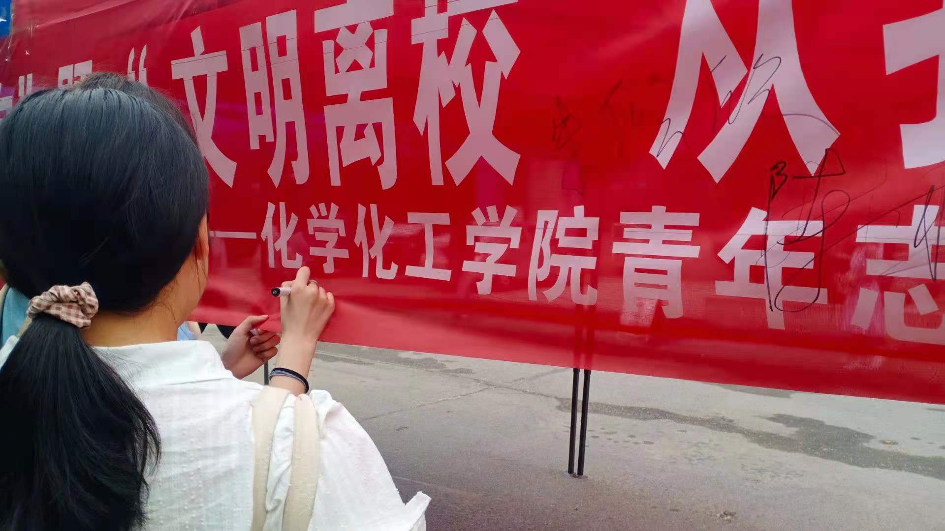 活动中,毕业生手写便签,向祖国、学校、学院、老师、父母、朋友等表达感恩之情,并在条幅上签名,承诺:文明离校,从我做起,将以崇高的实际行动,做到“四留下”:为自己留下美好回忆、为低年级同学留下学习榜样、为母校留下完美印象、为自己站好最后一班岗。