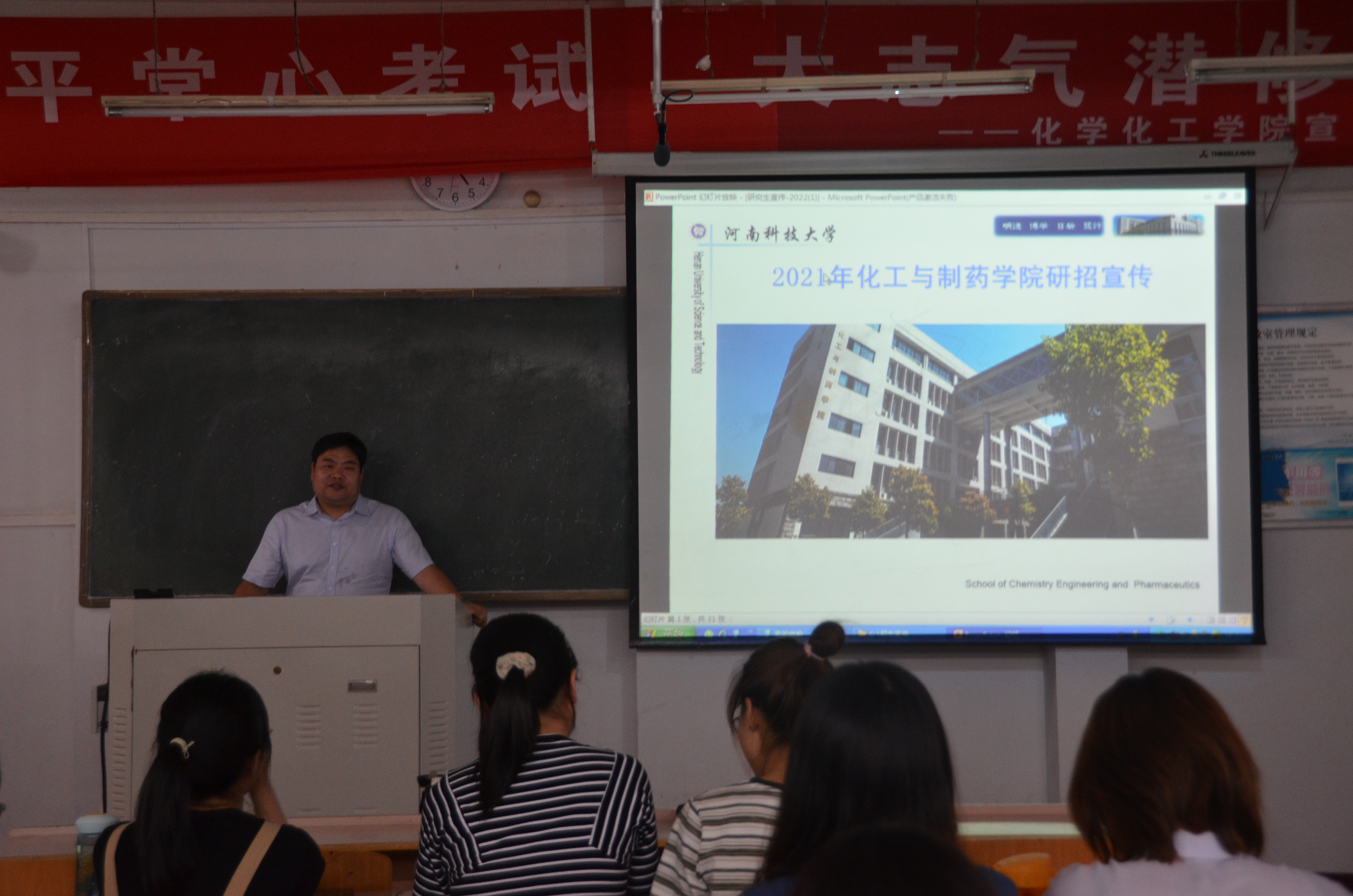 宣讲会上,李军波向同学们详细地介绍了河南科技大学化工与制药学院,学院师资力量雄厚,拥有强大的博士团队,积极开展国际交流合作,形成了科研资源共享、人才联合培养的良好局面。其次就学院研究生招生政策、招生专业、培养条件、学生就业等情况进行全面宣讲,并对我院学生在备考时应该注意的问题提供了辅导和培训。