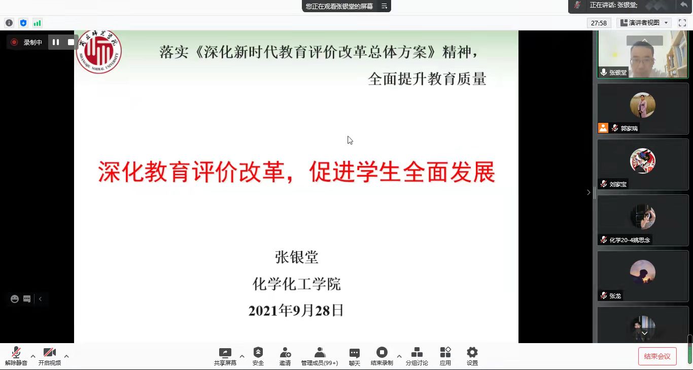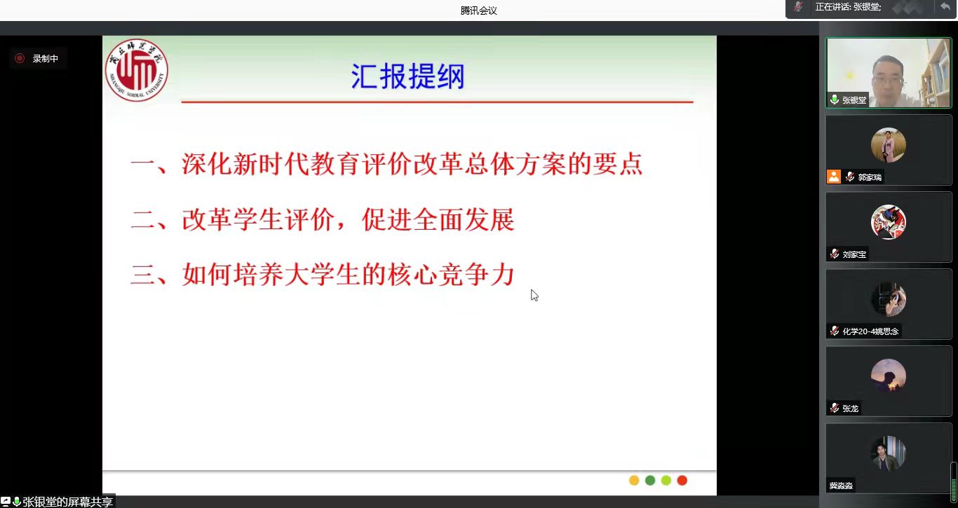 张银堂分别从深化新时代教育评价改革总体方案的要点、改革学生评价,促进全面发展、如何培养大学生的核心竞争力等三个方面展开讲述。张银堂指出,《深化新时代教育评价改革总体方案》坚持立德树人、问题导向、科学有效、统筹兼顾、中国特色五点主要原则,在改革学生评价,促进全面发展上要树立科学成才的观念,做到德智体美劳全面发展,从学习、创新、做人三方面培养大学生的核心竞争力。