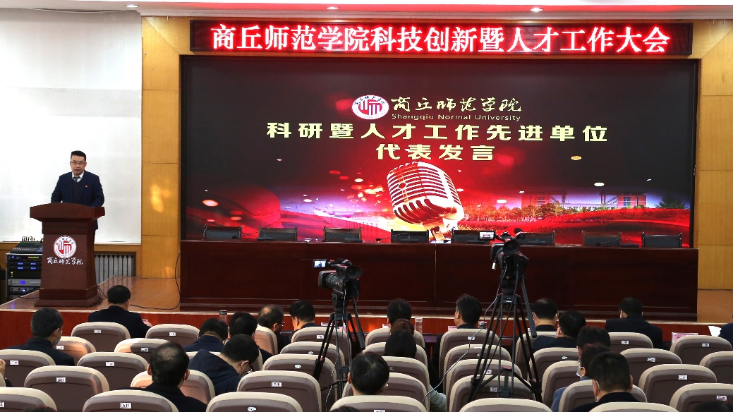 12月16日,商丘师范学院隆重召开科技创新暨人才工作大会。我院获得人才工作先进单位和科研工作先进集体荣誉称号,15名教师荣获科研工作个人奖。院长张银堂作为获奖单位代表在大会上发言。