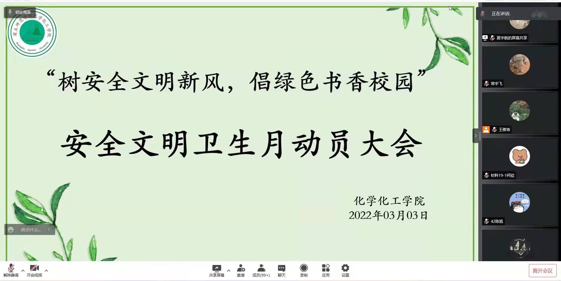 为推进校园精神文明建设,建设绿色书香校园,3月3日,我院通过腾讯会议举办了“安全文明卫生月”活动动员大会。党委副书记张颜梅、全体辅导员、寝室长和学生会成员参加。
