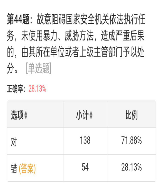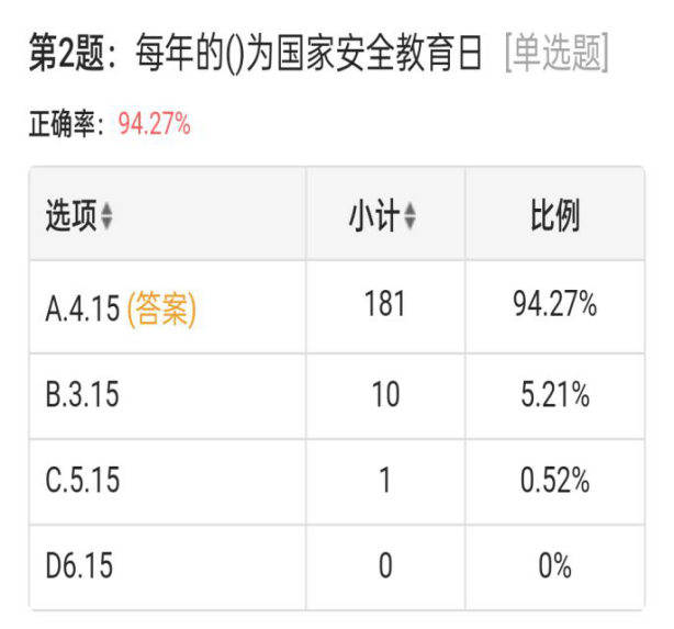 本次答题题型主要为单选题,主要内容是与国家安全相关的法律法规。活动共有192名同学参加,涵盖2021级和2020级两个年级学生。学生积极参与,并在规定时间内完成线上答题。通过答题活动,我院学生认识到国家安全的重要性,增强了忧患意识和责任意识。