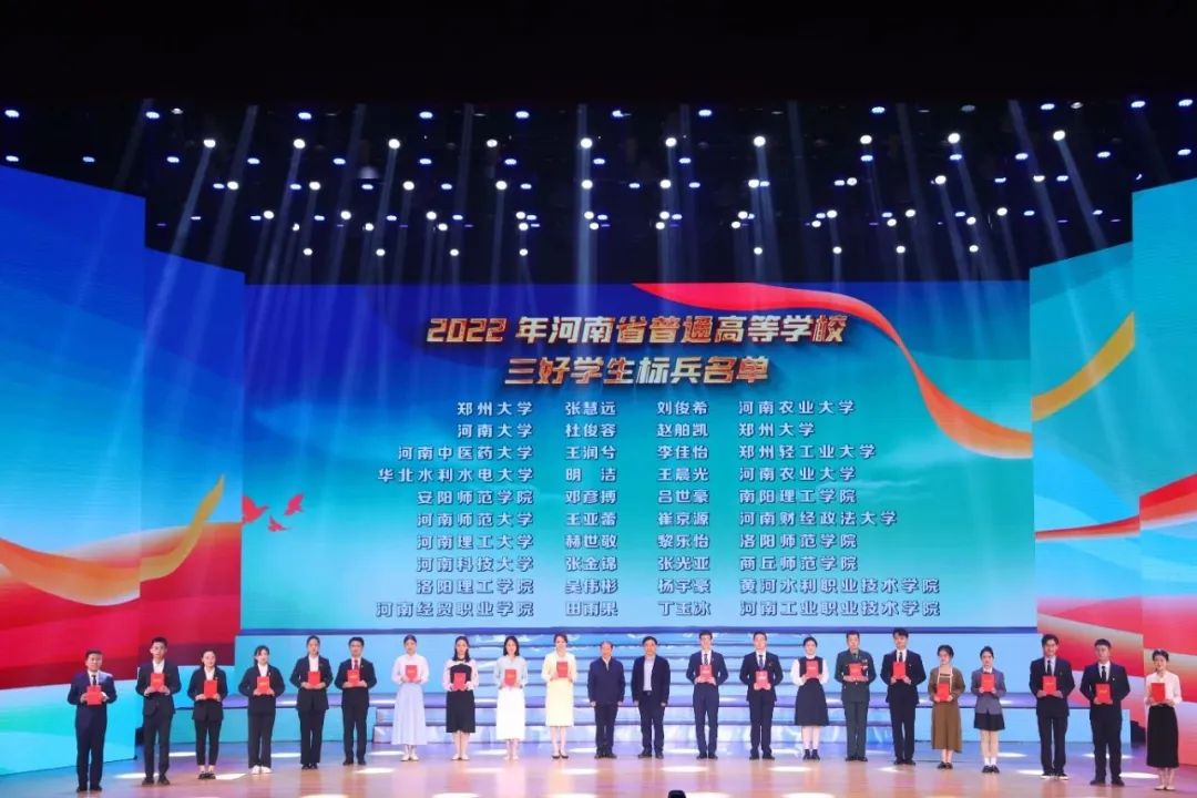 4月23日下午,2022年河南省普通高等学校三好学生标兵颁奖典礼在河南农业大学龙子湖校区举行。省委教育工委专职委员吕冰,河南农业大学党委副书记、校长介晓磊,共青团河南省委副书记王继威,河南农业大学党委副书记游舸,省教育厅思想政治工作处处长陈凯,省教育厅学生工作处处长李班,共青团河南省委学校部部长刘淑丽出席颁奖典礼,我院学生张光亚作为三好学生标兵上台领奖。
