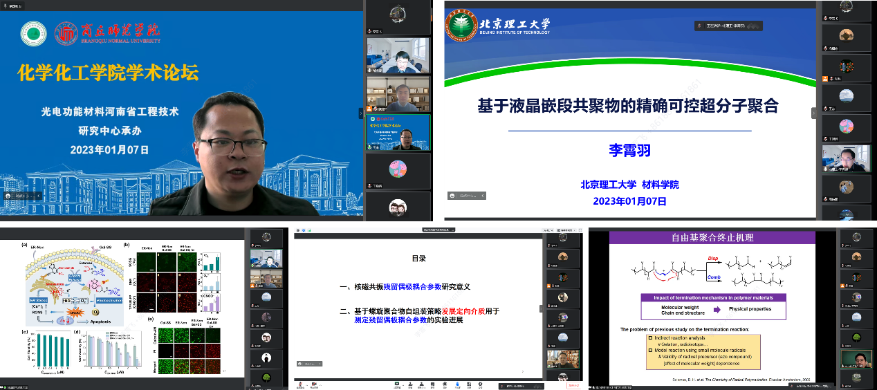 1月7日,由光电功能材料河南省工程技术研究中心承办的第四期学术论坛采用线上方式进行。南京大学教授、博士生导师、国家海外高层次人才引进青年计划冯福德教授,北京理工大学教授、博士生导师、国家海外高层次人才引进青年计划李霄羽教授,以及我院教师李高伟博士、李小培博士应邀为我院师生作学术报告。报告会由麻豆精品㊙️国产传媒AV副院长王涛、光电功能材料河南省工程技术研究中心张弛老师共同主持,麻豆精品㊙️国产传媒AV部分教师和研究生参加报告会。