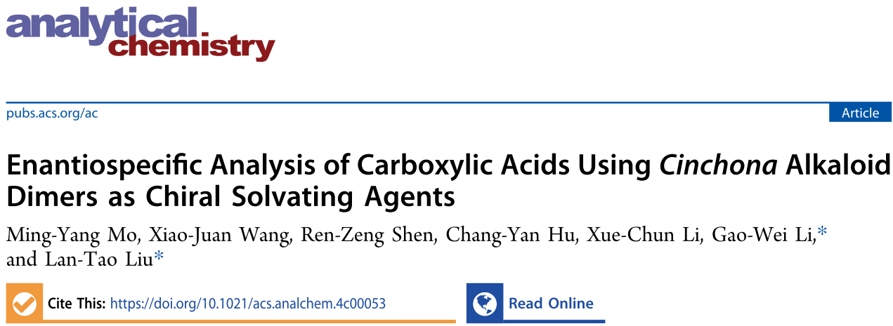 近日,商丘师范学院与郑州大学联合培养的2021级有机化学专业硕士研究生莫明洋作为第一作者在国际知名期刊Analytical Chemistry(中科院一区,IF=7.4,TOP期刊)上发表了题为“Enantiospecific Analysis of Carboxylic Acids Using Cinchona Alkaloid Dimers as Chiral Solvating Agents”的研究论文(论文链接:https://doi.org/10.1021/acs.analchem.4c00053)。该研究报道了一种基于金鸡纳碱二聚体为核磁共振手性位移试剂,通过核磁共振波谱技术对扁桃酸及其衍生物进行高效、快速与准确的手性识别与分析。
