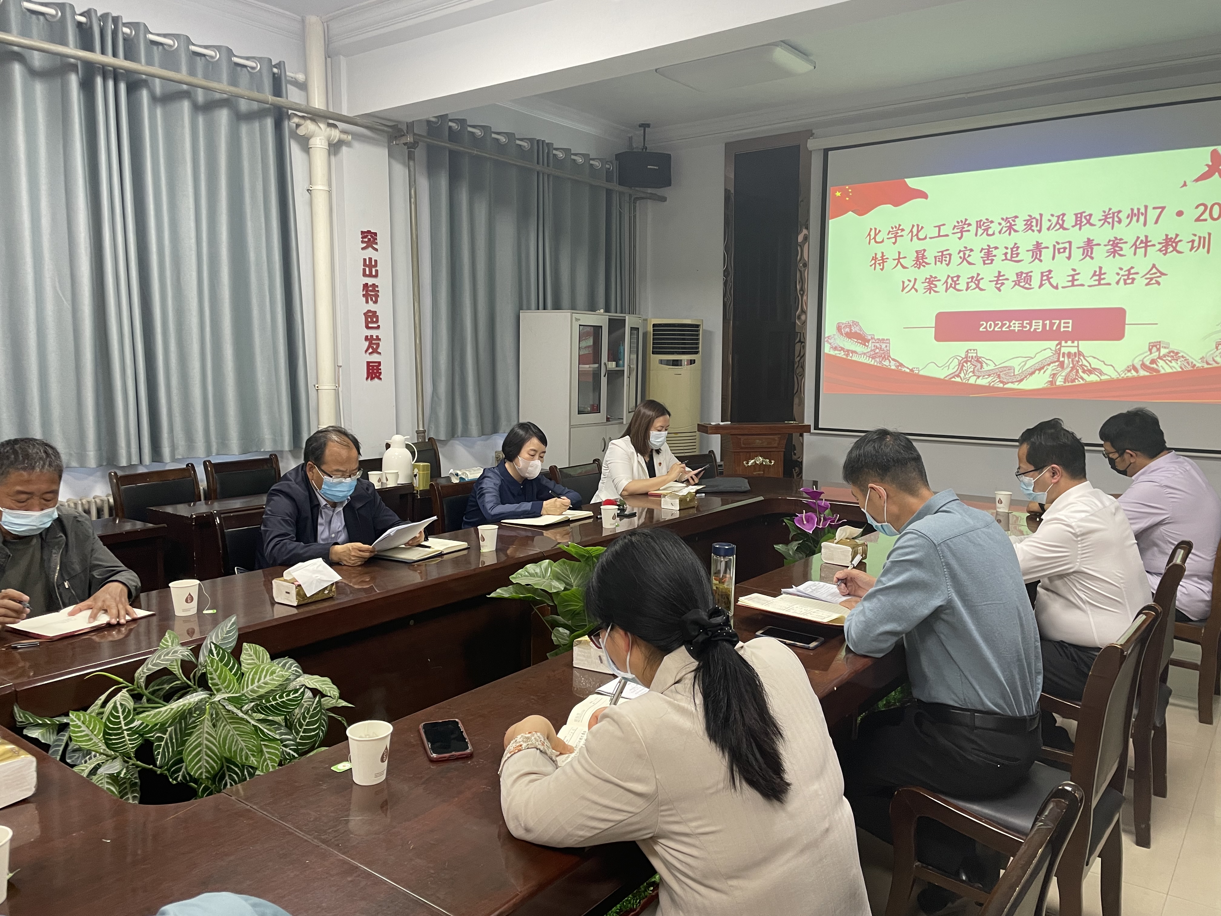 按照《中共商丘师范学院委员会<关于深刻汲取“7·20”特大暴雨灾害追责问责案件教训开展以案促改专题民主生活会的通知>》要求,5月17日下午,麻豆精品㊙️国产传媒AV召开郑州“7·20”特大暴雨灾害以案促改专题民主生活会。学校专题民主生活会第八指导组组长、副校长郭文佳和指导组成员统战部部长黄蕾、纪委第一纪检监察室主任任鸿敏以及学校纪检监察员监督指导组组长韩忠民莅临指导。院党政领导班子成员参会,河南省生物分子识别与传感重点实验室副主任朱旭、药物绿色合成河南省工程实验室主任李峰列席会议。会议由院党委书记李海涛主持。