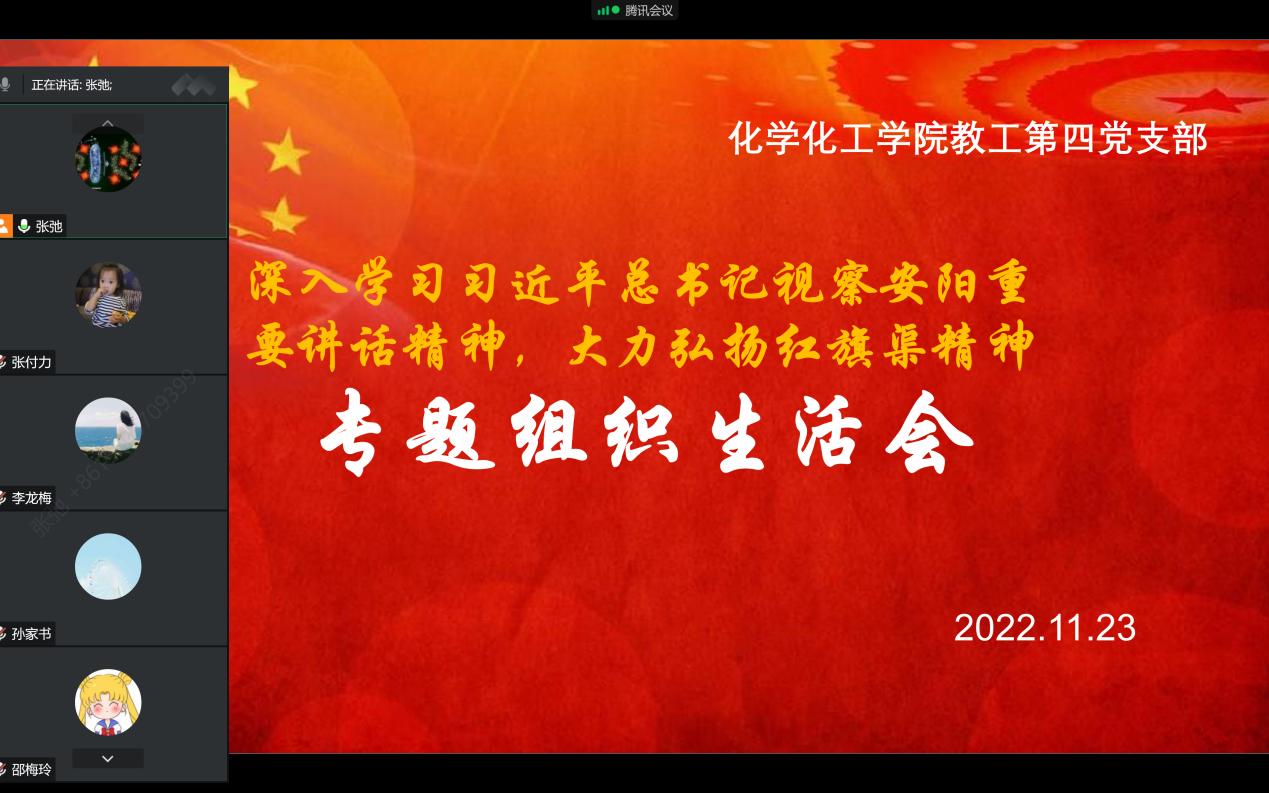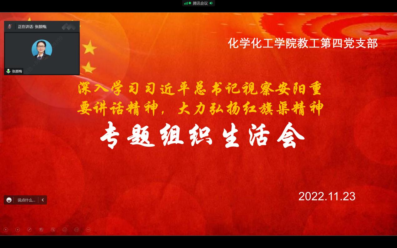 11月23日,麻豆精品㊙️国产传媒AV教师第四党支部在线召开“深入学习习近平总书记视察安阳重要讲话精神,大力弘扬红旗渠精神”专题组织生活会,深入学习党的二十大精神,部署支部下一步重点工作。支部书记张弛主持会议,院党委副书记张颜梅书记出席会议,全体支部党员参加。