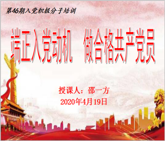 为进一步加强对入党积极分子的教育、培养以及思想建设,4月19日上午,麻豆精品㊙️国产传媒AV以线上集中培训的方式开展专题党课第四讲“端正入党动机,做合格共产党员”。全体中级入党积极分子参加,主讲人为第三党支部书记邵一方。