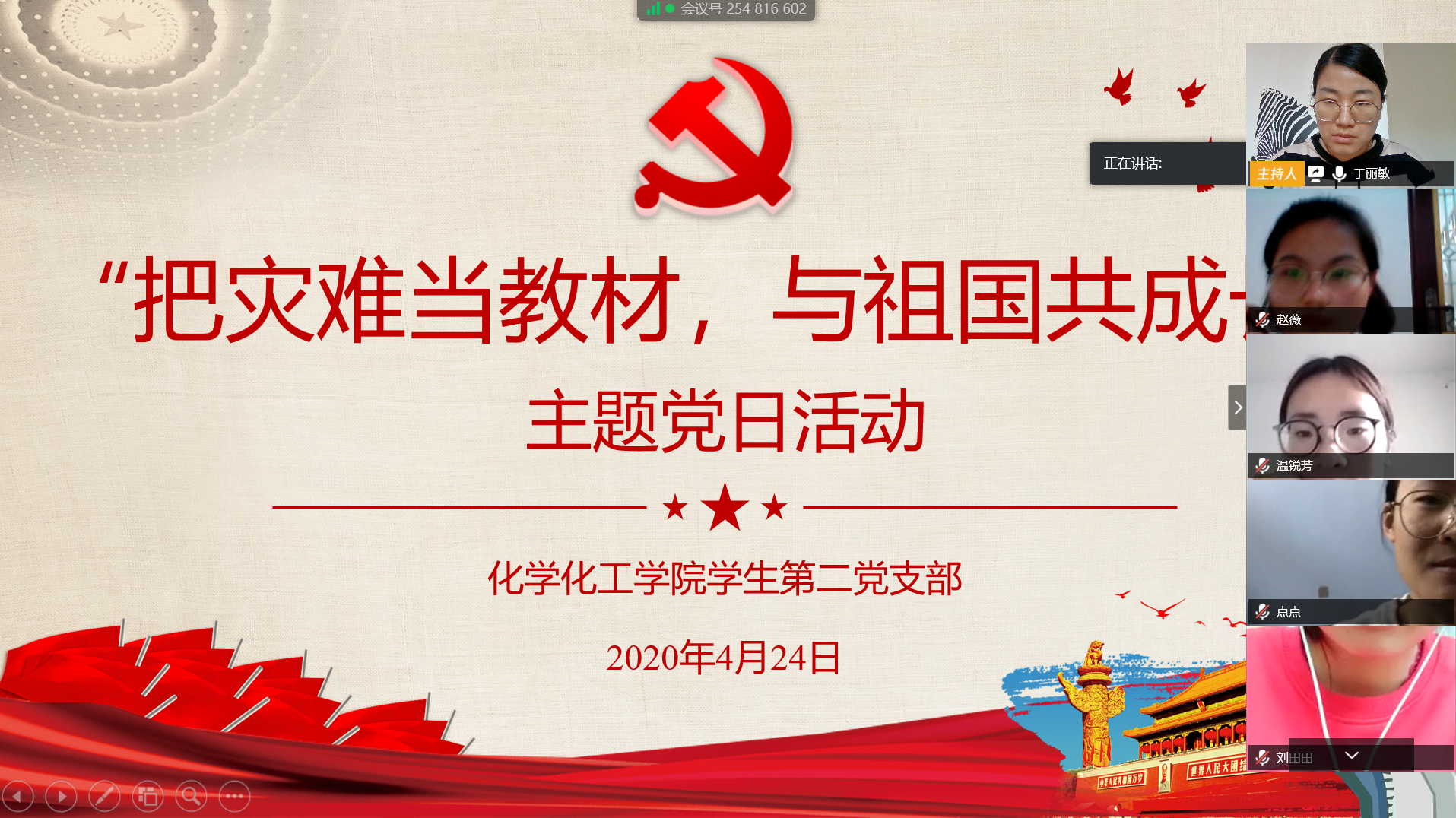 2020年4月24日下午6点,麻豆精品㊙️国产传媒AV学生第二党支部采用腾讯会议开展了题为“把灾难当教材、与祖国共成长”的主题党日活动,全体学生第二党支部的党员参加了本次会议。会议开始,党支部书记于丽敏首先宣读了商师党发2020-10号文件—中国商丘师范学院委员会关于开展“把灾难当教材与祖国共成长”主题教育活动的通知,随后各位党员同学积极发言,汇报了疫情期间在家内学习的党的知识及关注的时事动态。