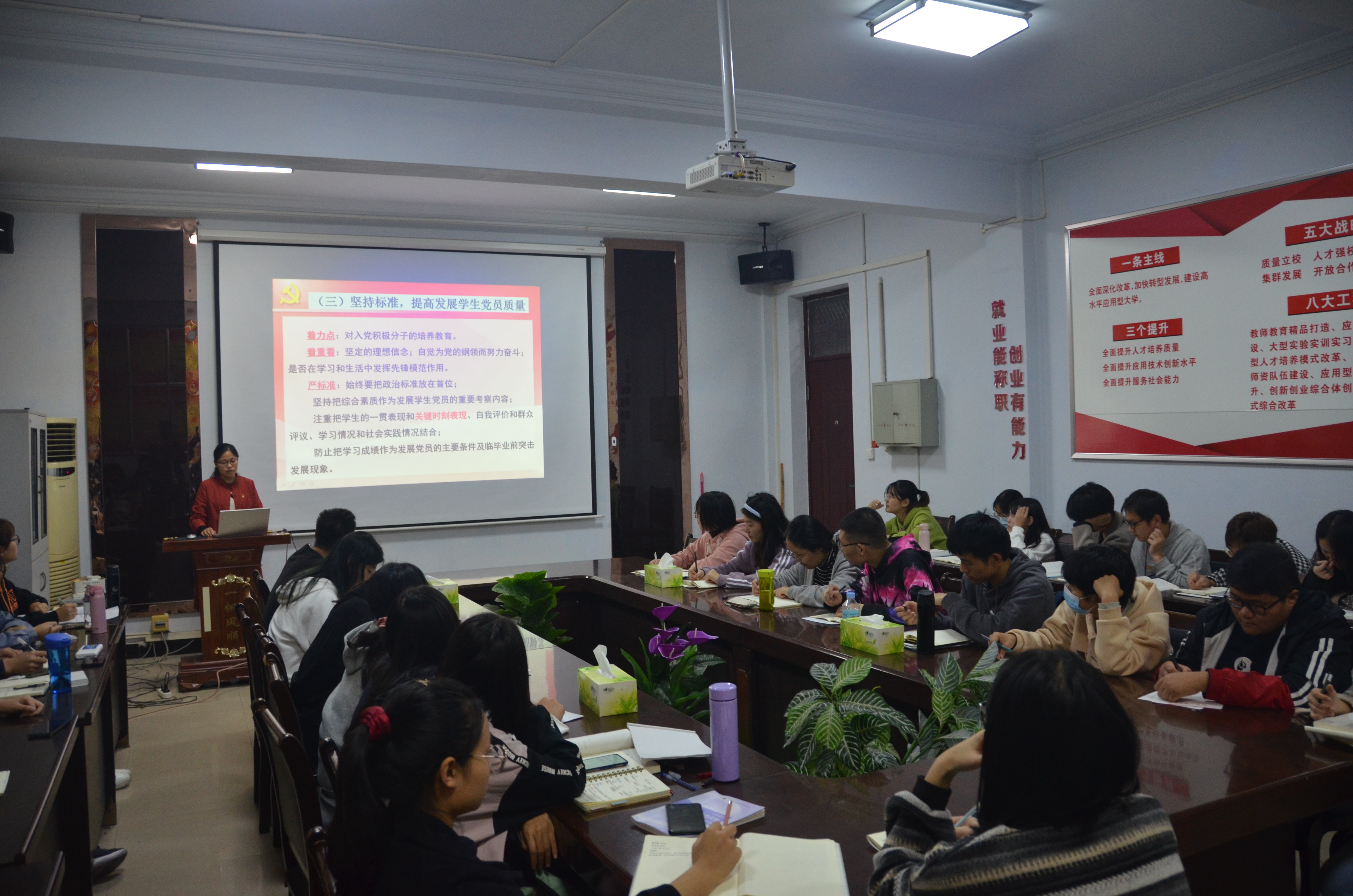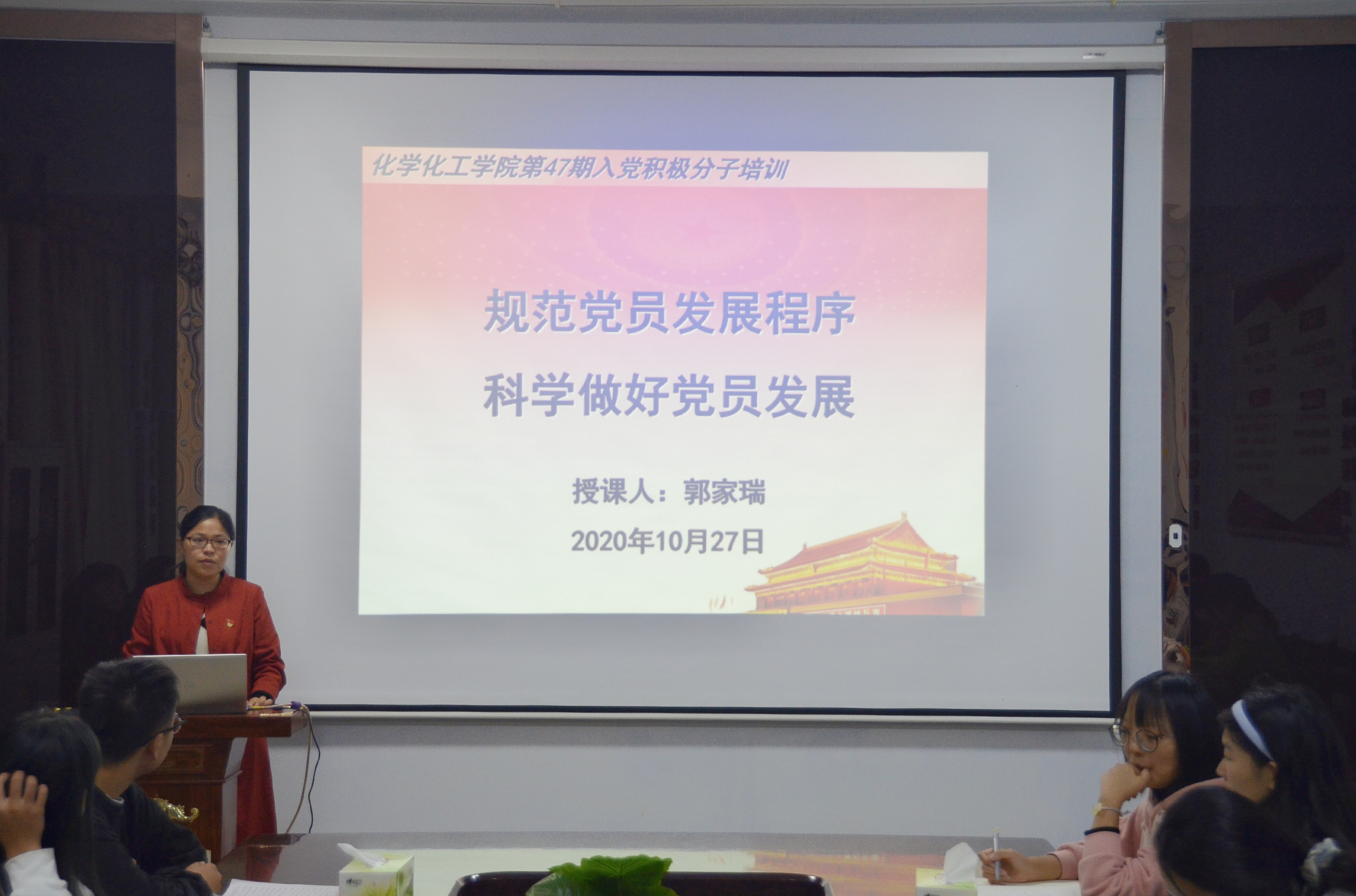 为深入学习贯彻习近平新时代中国特色社会主义思想,明确新形势下党员发展工作标准,确保党员质量,把发展党员工作科学化、规范化和制度化,提高党员素质,保证党员队伍的先进性和纯洁性。2020年10月27日晚,麻豆精品㊙️国产传媒AV团总支副书记郭家瑞为第47期入党积极分子培训班(中级)学员上了专题党课:“规范党员发展程序,科学做好党员发展——第二讲”。