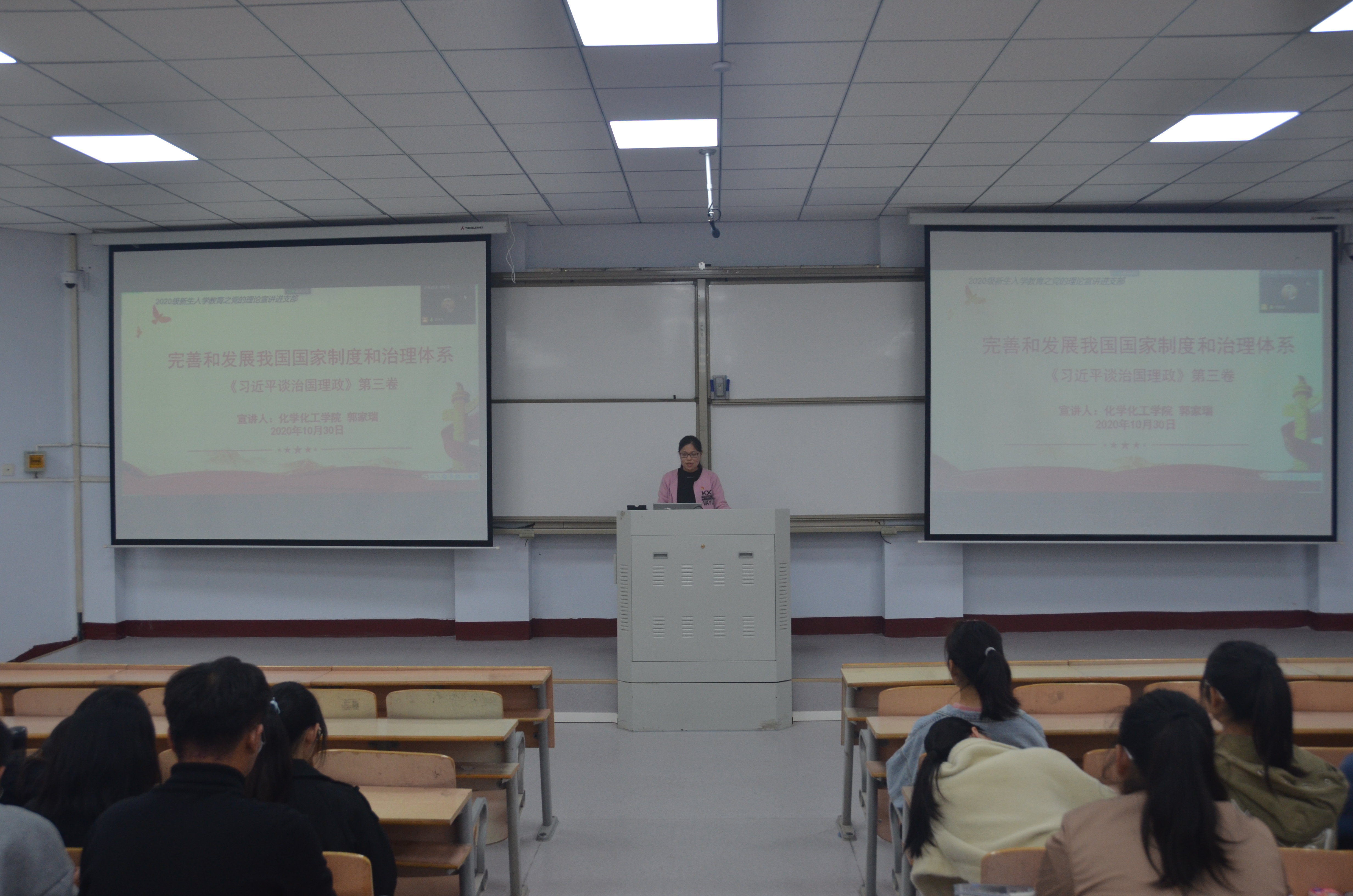 郭家瑞以《习近平谈治国理政》第三卷第三专题“完善和发展我国国家制度和治理体系”为主题,从党的集中统一领导、人民当家作主、坚持全国一盘棋、社会主义基本经济制度、以人民为中心、选贤任能等多个方面为同学们讲述我国国家制度和治理体系的显著优势,使同学们了解到中国特色社会主义制度具有显著优势,但还需要不断完善和发展,使之更加成熟定型以展现出更加显著的优势。宣讲中,同学们积极讨论发言。最后郭家瑞希望同学们积极主动学习《习近平治国理政》第三卷,不断加强理论修养,树立正确的世界观、人生观和价值观。