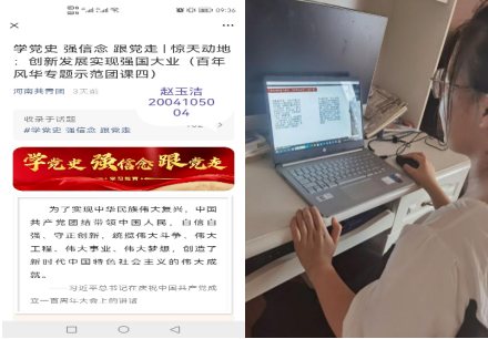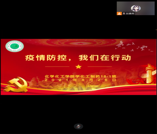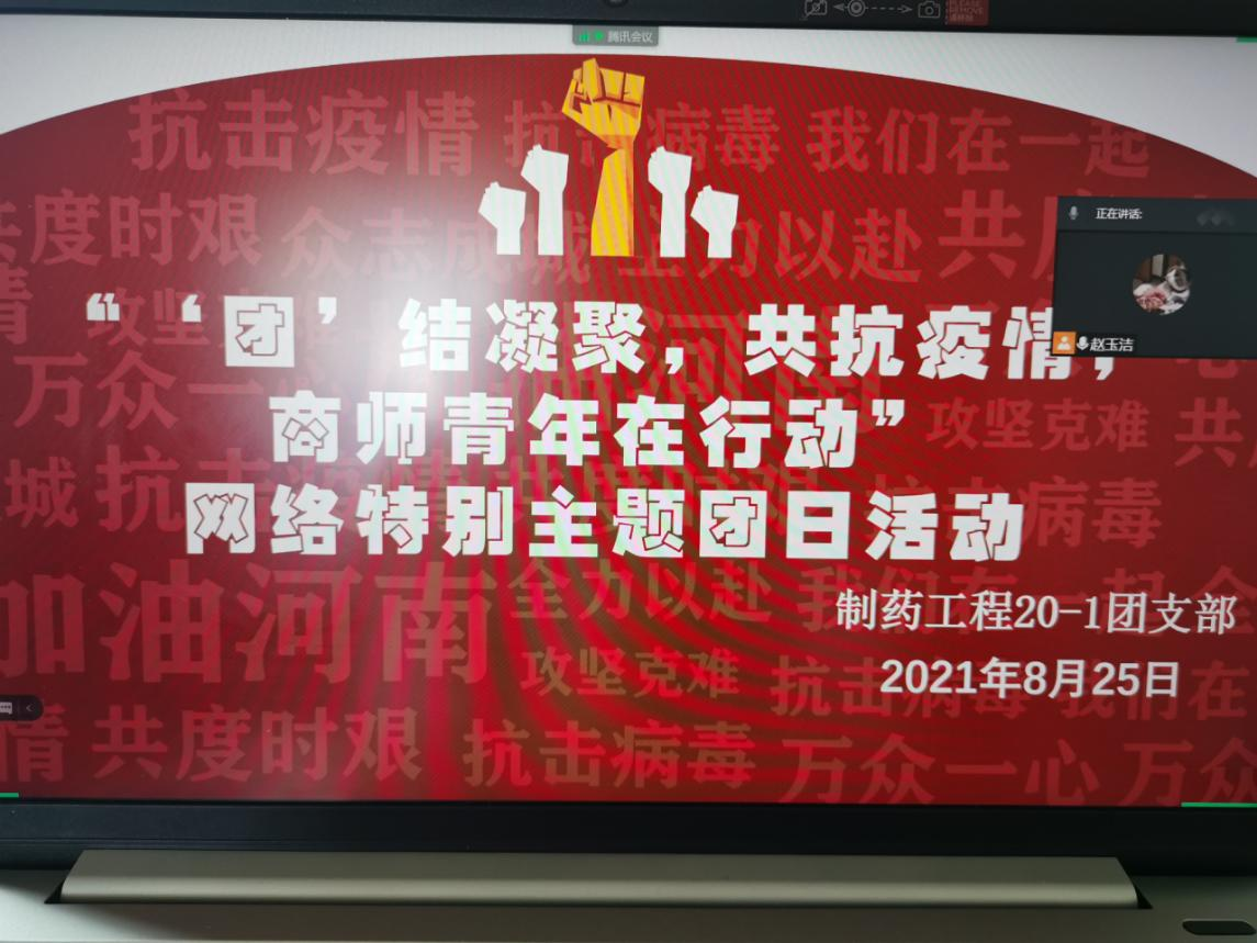 8月26日,化工制药18-1团支部通过腾讯会议组织召开主题团日活动。活动开始,团支部书记赵鑫俐首先传达了校团委《关于开展“‘团’结凝聚,共抗疫情,商师青年在行动”网络特别主题团日活动》文件通知精神,要求支部成员做好假期线上学习、积极参加主题团日活动、主动遵守学校和当地疫情防控要求。之后集体学习了本期青年大学习——惊天动地:创新发展实现强国大业(百年风华专题示范团课四),引领广大青年学党史、强信念、跟党走,确保暑期思想政治引领工作不断线。之后,带领成员学习了防疫科普知识,引导支部成员理性认识疫情,科学做好防护。
