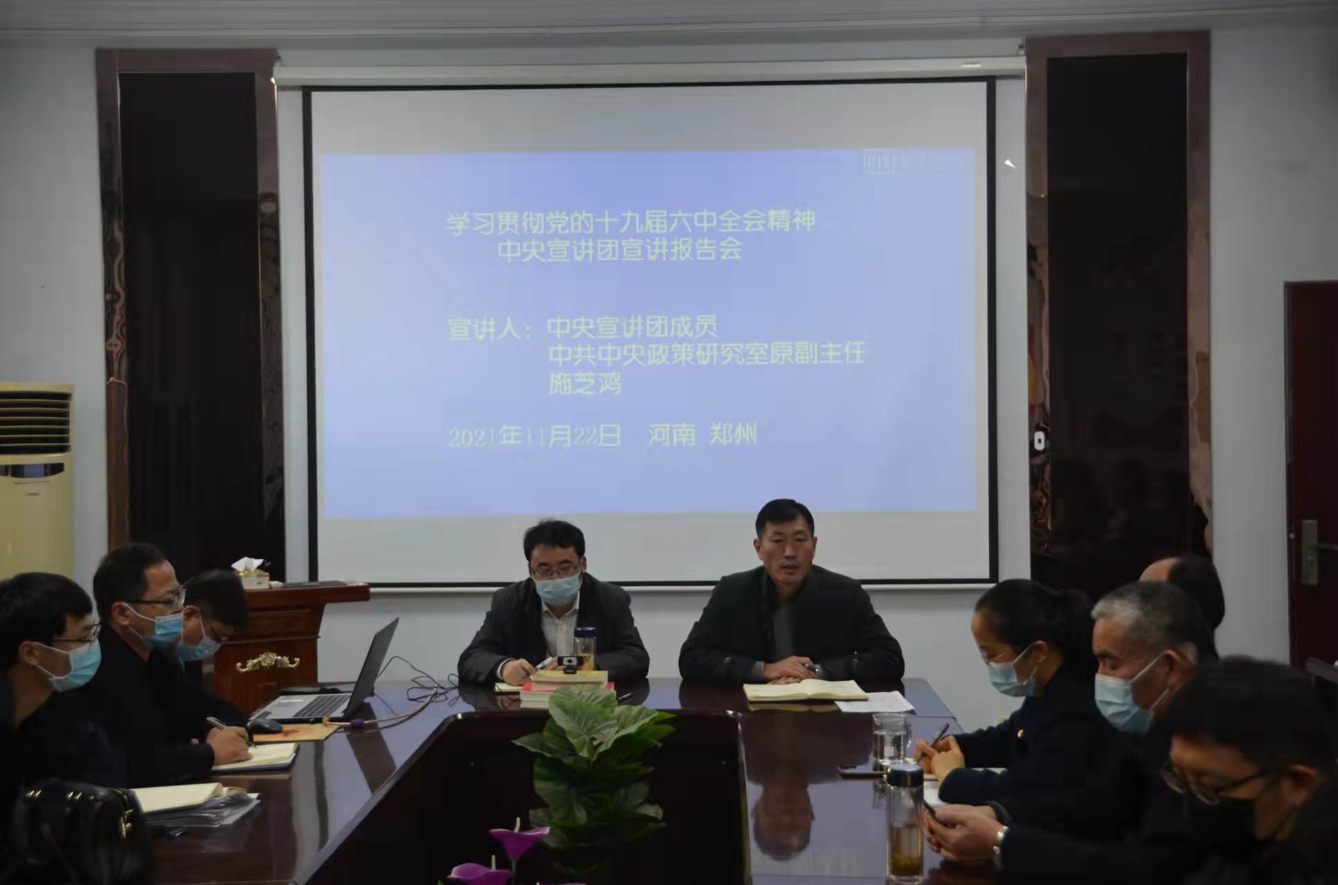 党的十九届六中全会精神中央宣讲团报告会在豫宣讲的主讲人为中共中央政策研究室原副主任施芝鸿,施芝鸿从深刻认识和把握“党中央对党的十九届六中全会议题的考虑和起草批次决议的明确要求”,“决议用分时期、大写意方式概述的对我们党百年奋斗史上的前三个时期经验教训的深刻总结和重要结论”,“决议用分领域、工笔画方式重点呈现的我们党百年奋斗史上第四个时期‘开创中国特色社会主义新时代’取得的历史性成就、发生的历史性变革”,“决议以更宏阔视野贯通我们党的百年奋斗历史逻辑、理论逻辑、实践逻辑的第五、六部分的论述和论断”,“决议第七部分关于在新时代新征程新的‘赶考’之路上以史为鉴、开创未来的重要论述及对全党同志的殷切寄语”五个方面,对党的十九届六中全会精神进行全面宣讲和深入解读。