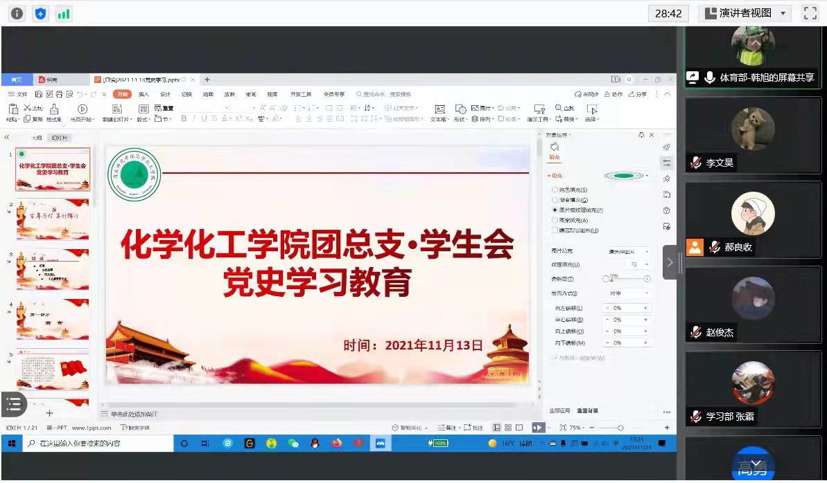 为进一步贯彻落实习近平总书记在党史学习教育大会上的重要讲话精神,提高同学们的思想高度,坚定理想信念。11月13日中午,麻豆精品㊙️国产传媒AV团总支·学生会于线上组织开展党史学习教育。