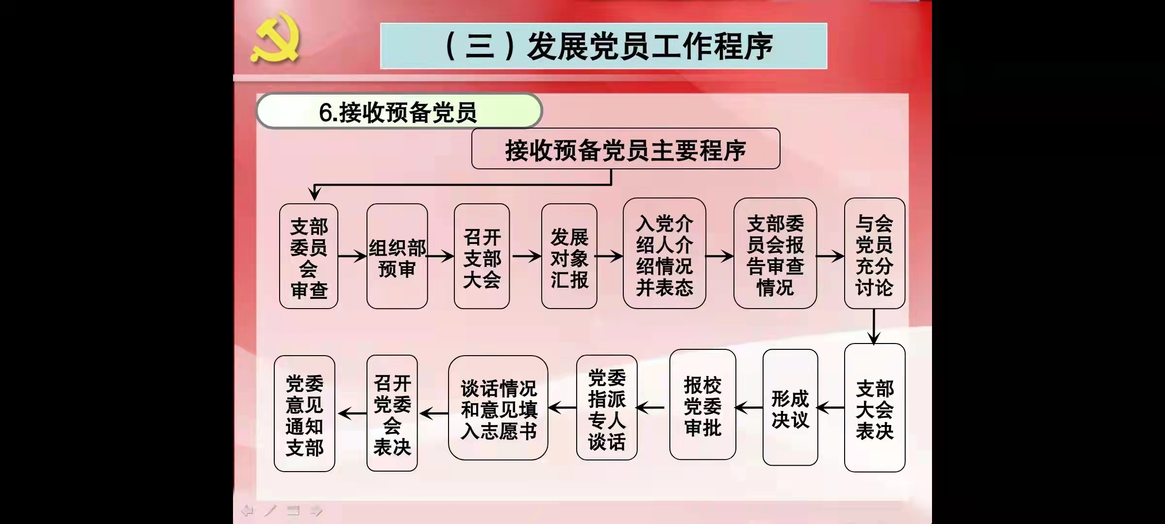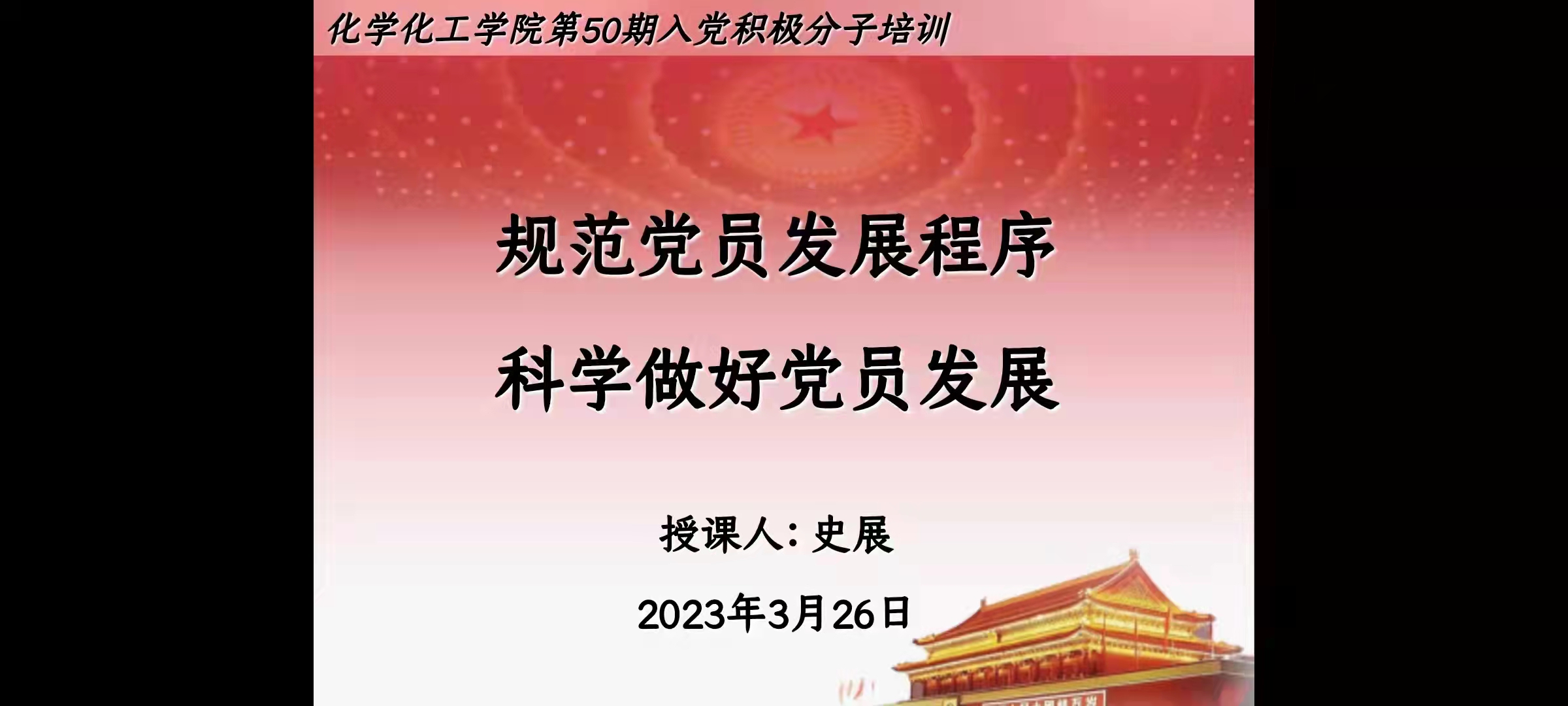 史展首先提出了发展党员的要求:严格标准、严格培养、严格程序、严格责任、从严治党,确保党员质量,提升党员素质。随后从申请入党的条件以及发展党员工作的方针、原则和程序进行讲解,使同学们详细了解了党员的培养过程。最后史展要求入党积极分子要以党员的标准严格要求自己,担负起新时代赋予的重任。