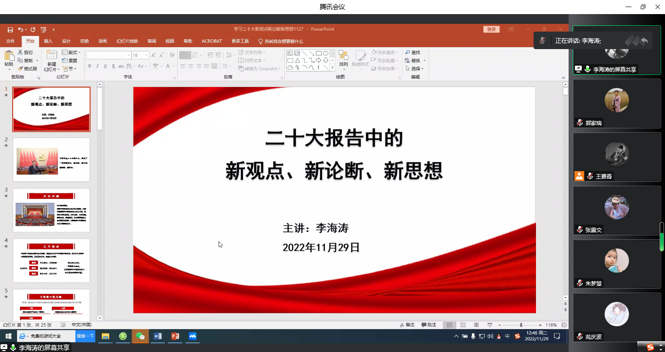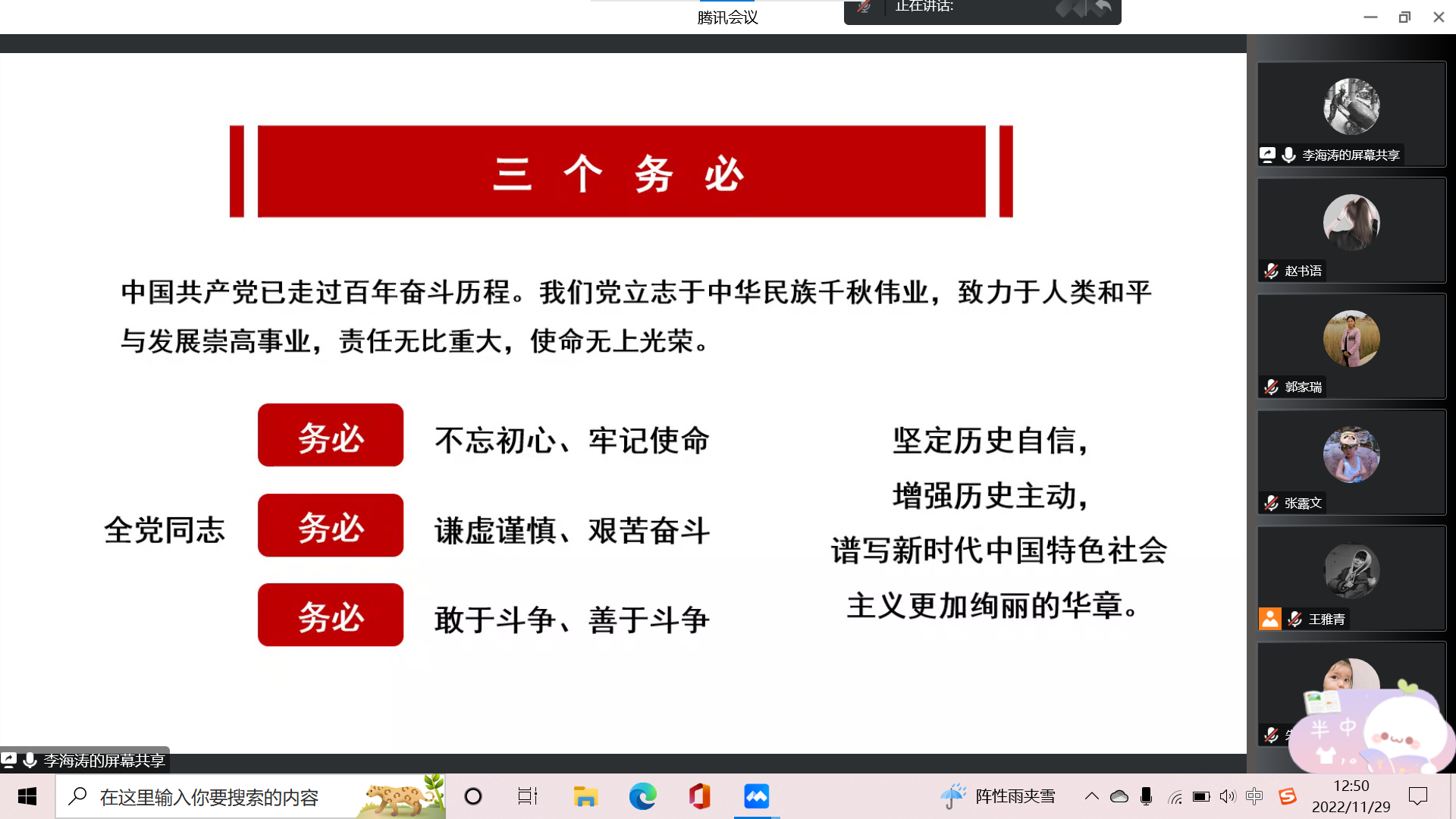 为落实分党校预备党员的培训制度,引导学生预备党员深入学习贯彻党的二十大,11月29日中午,麻豆精品㊙️国产传媒AV党委在线组织开展了第一场预备党员培训,院党委书记李海涛为参训学员上了题为“学习二十大,奋进新征程--二十大报告中的新观点、新论断、新思想”的党课。学生第四党支部书记郭家瑞和学生预备党员参加。