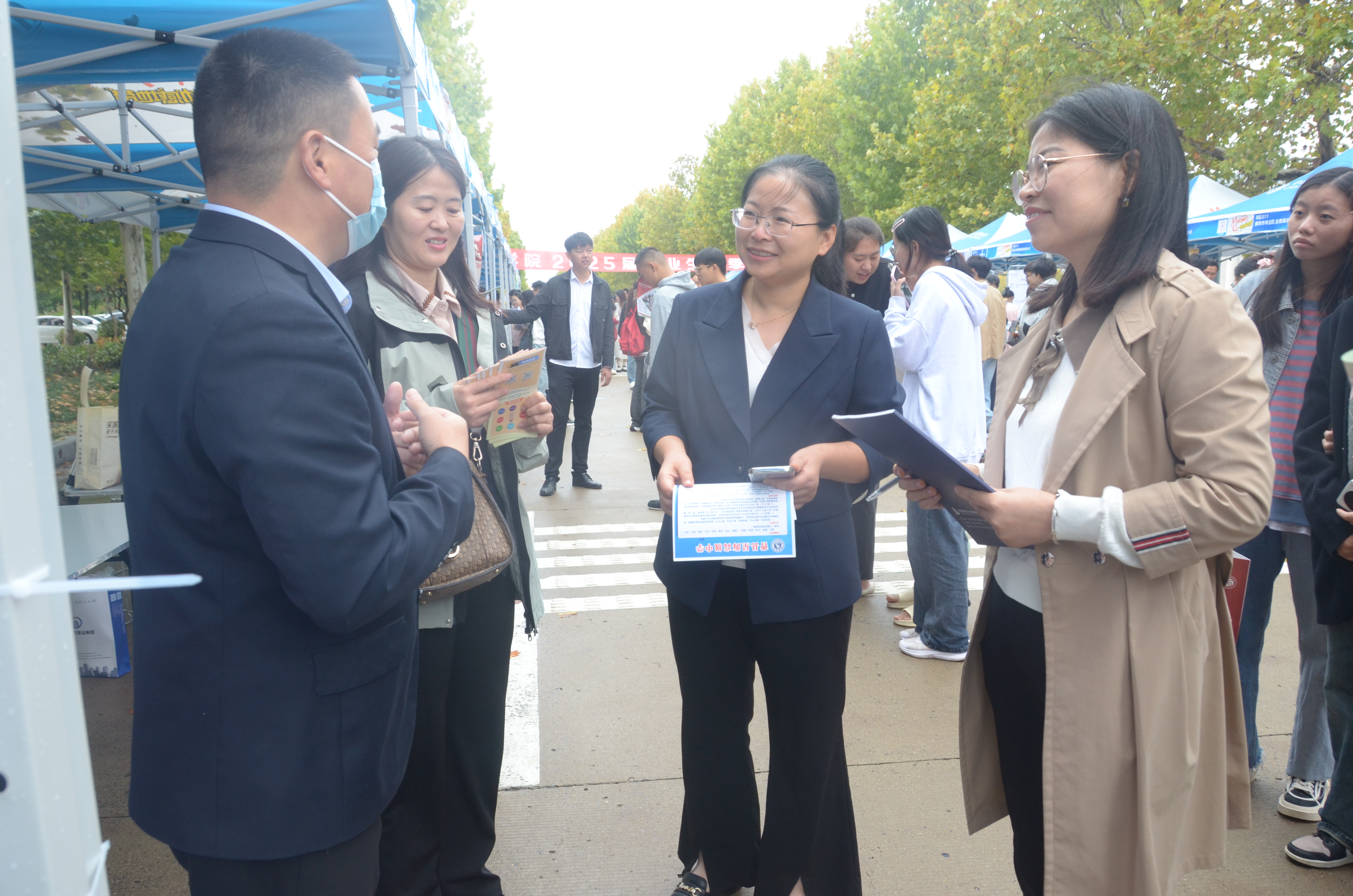 学院党委副书记张颜梅带领2025届毕业生辅导员郭家瑞来到洽谈会现场,深入了解了各用人单位的企业文化、岗位职责和职业要求,以便更好地为毕业生就业问题做出指导并为学生们解答求职过程中的各种问题。
