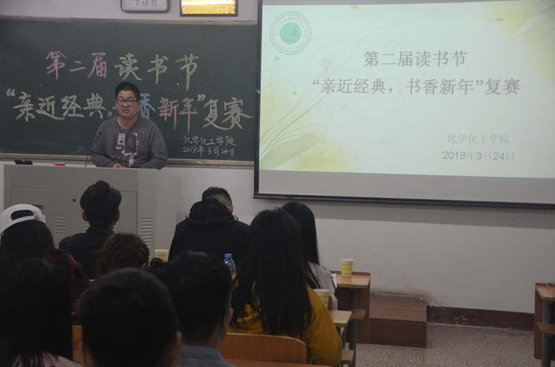 为激发我院同学的阅读热情,丰富文化生活,提高文学欣赏水平,营造浓郁的校园读书氛围,促使广大学生远离手机亲近书本,我院于3月24日晚7点在文化路校区1#408教室举行第二届读书节“亲近经典,书香新年”复赛,我院团总支、学生会主席团出席并担任评委。